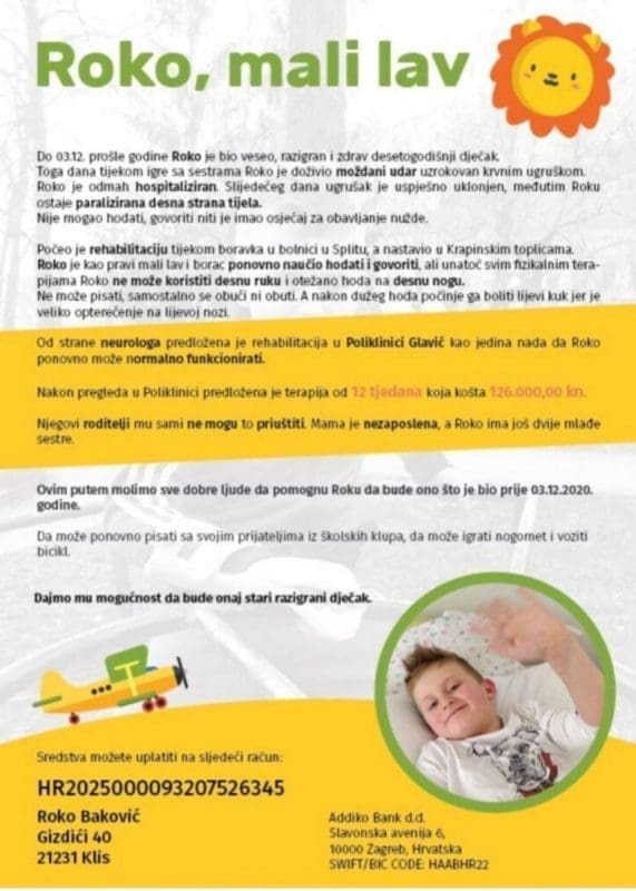 Do 3. prosinca prošle godine Roko je bio veseo, razigran i zdrav desetogodišnjak. No, tog je dana, tijekom igre sa sestrama doživio moždani udar, uzrokovan krvnim ugruškom. Hospitaliziran je, ugrušak je otklonjen, međutim, Roku ostaje paralizirana desna strana tijela. Nije mogao hodati, govoriti, niti imati osjećaj za obavljanje nužde.