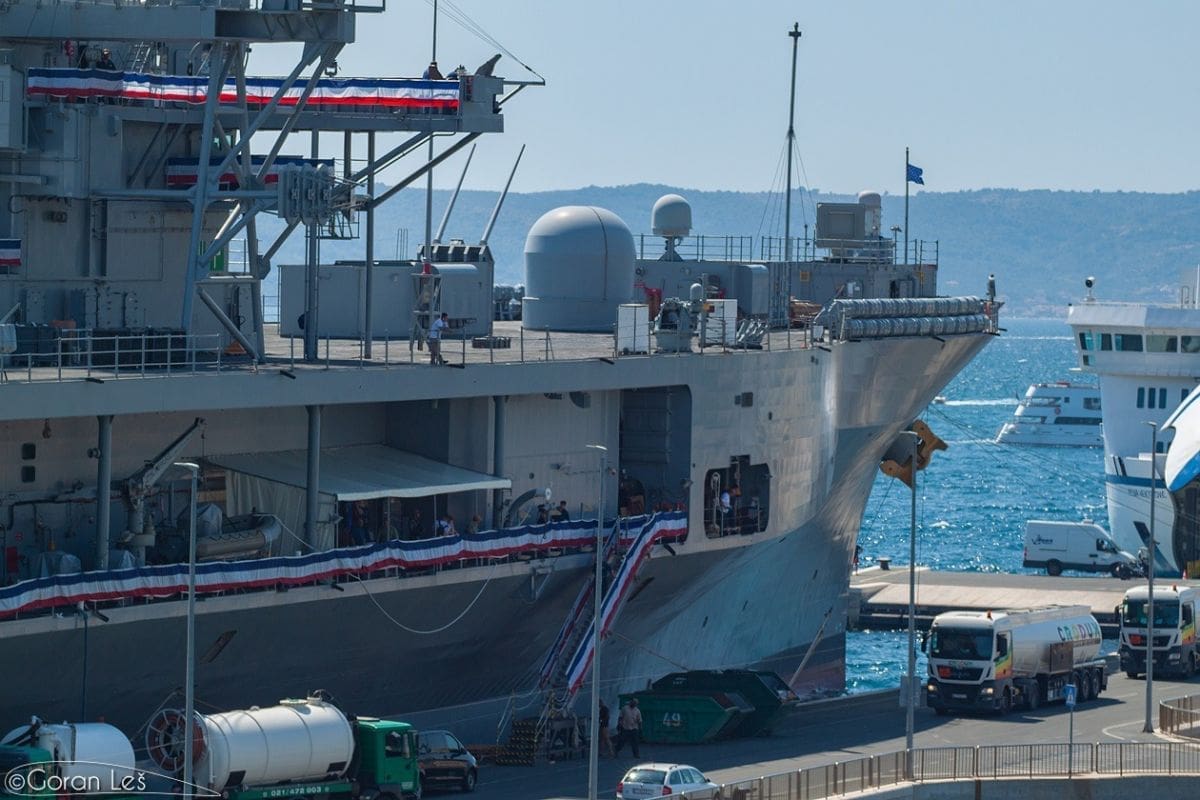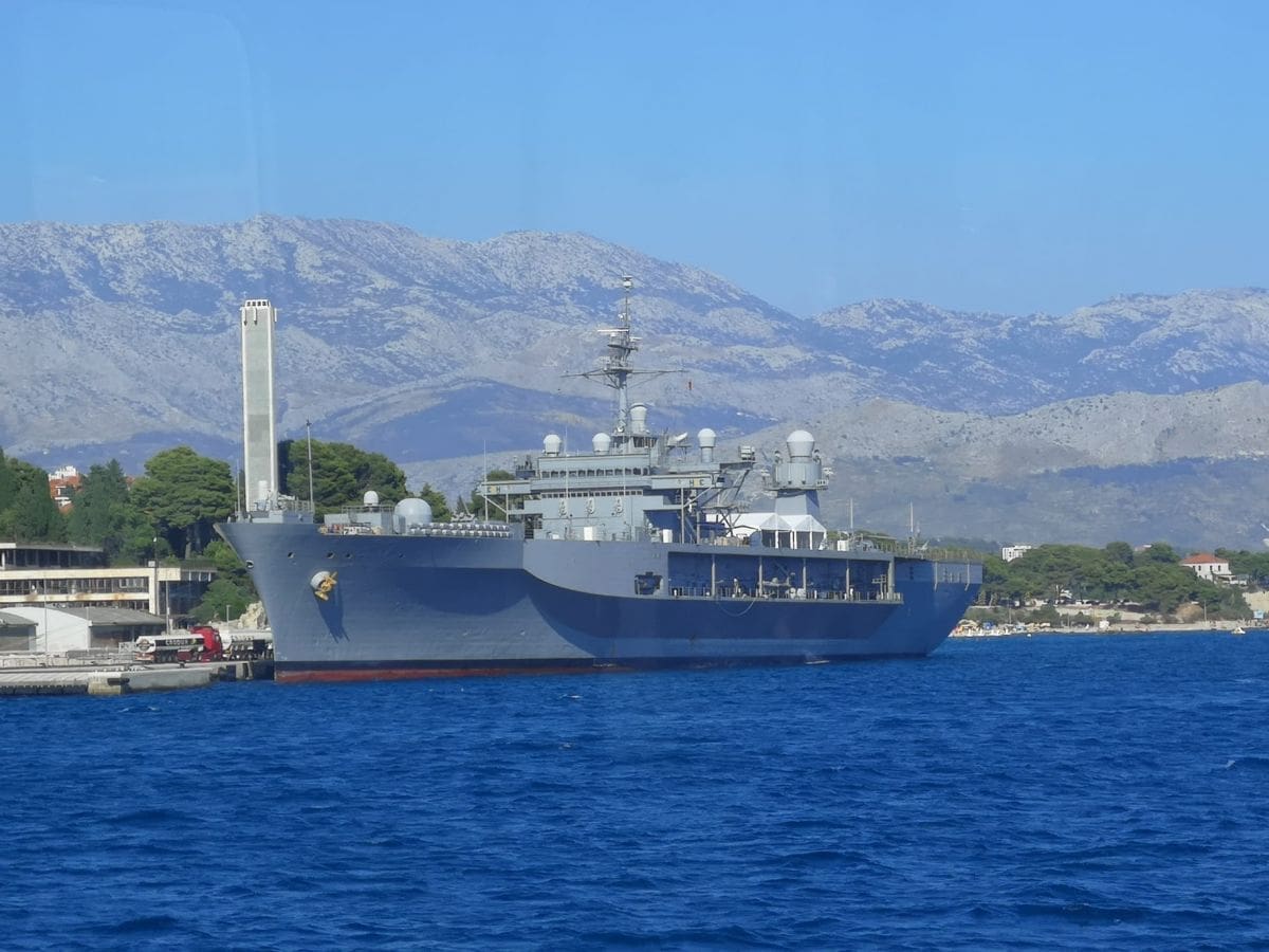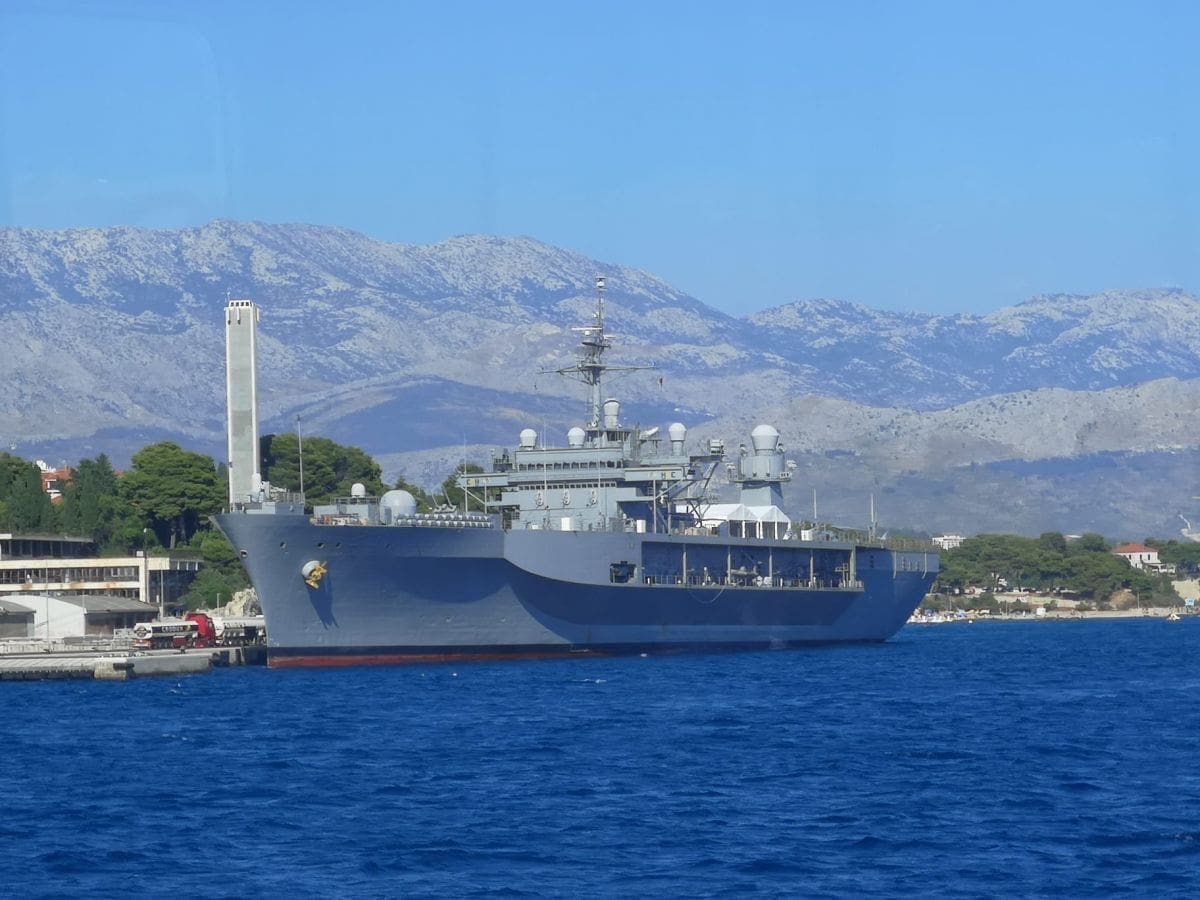 - U Splitu će biti 4 dana. Radi se o zapovjednom brodu američke 6. flote. Boravi u višednevnom posjetu Splitu. S obzirom da je bio problem s Lorom, zatraženo je ako mogu uploviti na vanjski vez luke. Brod je uplovio danas ujutro, a nisu planirane posjete građana.