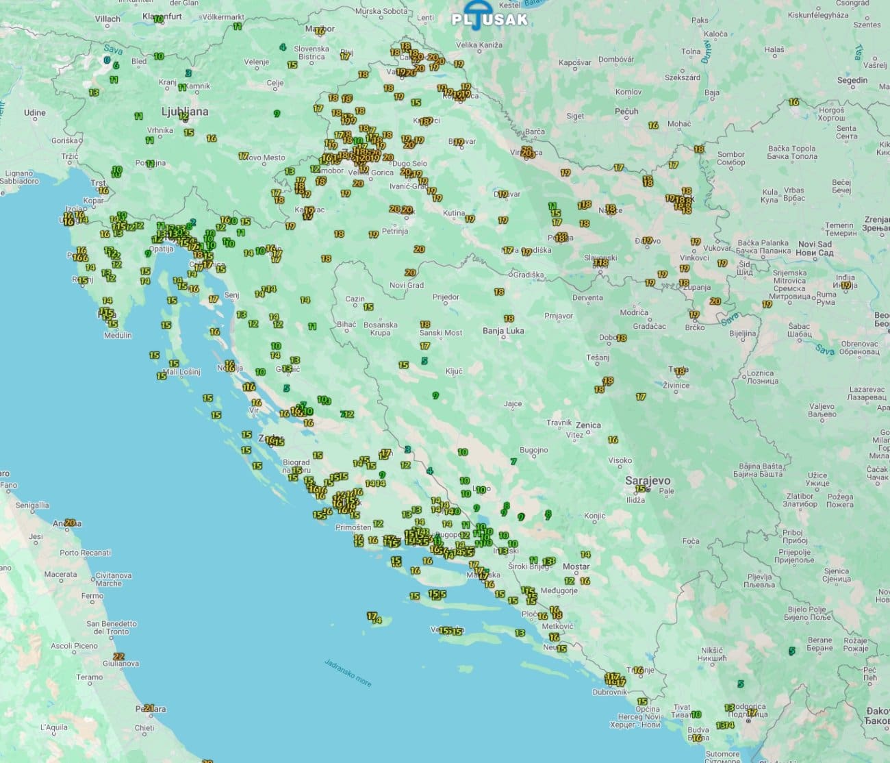 U vrijeme pisanja teksta grmljavinske linije gotovo je paralelna s hrvatsko-slovenskom granicom, a područje zahvaćeno pljuskovima bilježi pad temperature zraka za 3 do 6 stupnjeva Celzijusa. U Slavoniji i Dalmaciji je i dalje toplo s temperaturama zraka do 16 stupnjeva.
