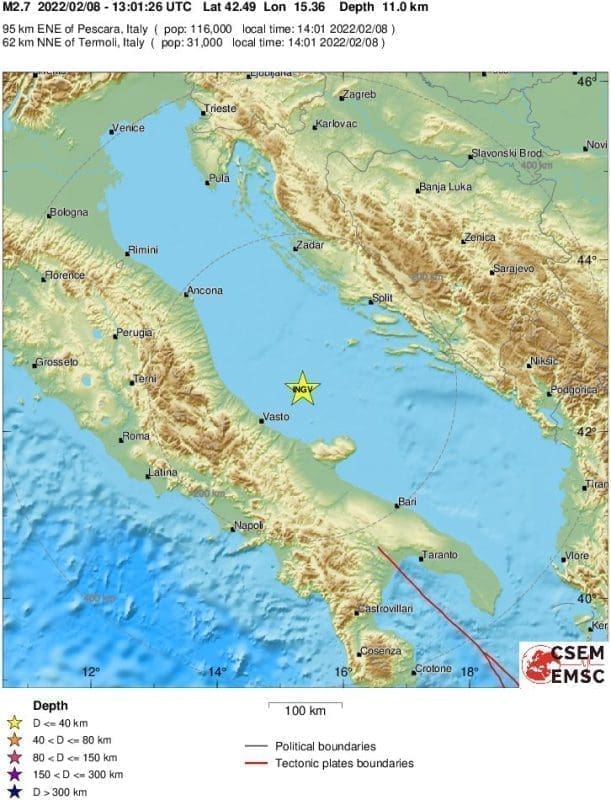 Prema podacima EMSC-a magnituda mi je iznosila 2.7 prema Richteru, a epicentar je bio 95 kilometara istočno-sjeveroistočno do Pescare.