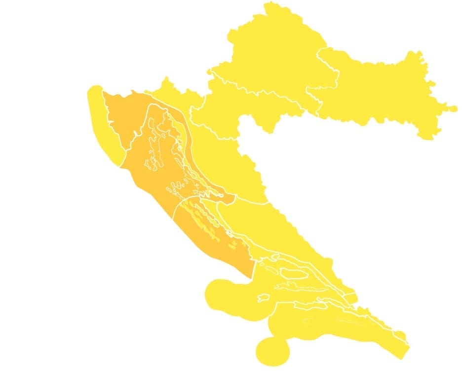 DHMZ je unutar sustava MeteoAlarm izdao narančasti stupanj upozorenja za sjeverni Jadran i to zbog vjetra i oborina. Očekuju se udari do 95 km/h, a ponegdje do 100 mm oborine. Za ostatak zemlje vrijedi žuto upozorenje, većinom zbog juga. Jugo će danas ponovno uzrokovati probleme u pomorskom prometu, iako manje nego u prošlu nedjelju.