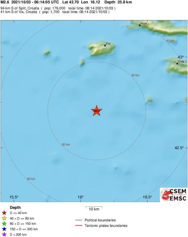 Prema podacima EMSC-a, magnituda potresa je iznosila 2.6 prema Richteru, a epicentar je bio 41 kilometar južno od Visa, te 94 kilometra južno od Splita.