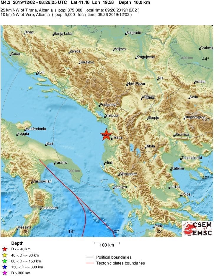 Magnituda je iznosila 4.3 po Richteru, a epicentar je bio 25 kilometara sjeverozapadno od Tirane.
