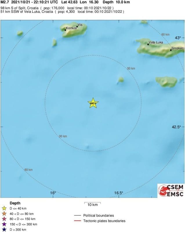 Prema podacima EMSC-a, 10 minuta nakon ponoći potres magnitude 2.7 prema Richteru imao je epicentar 98 kilometara južno od Splita, odnosno 51 kilometar jug-jugozapadno od Vele Luke.
