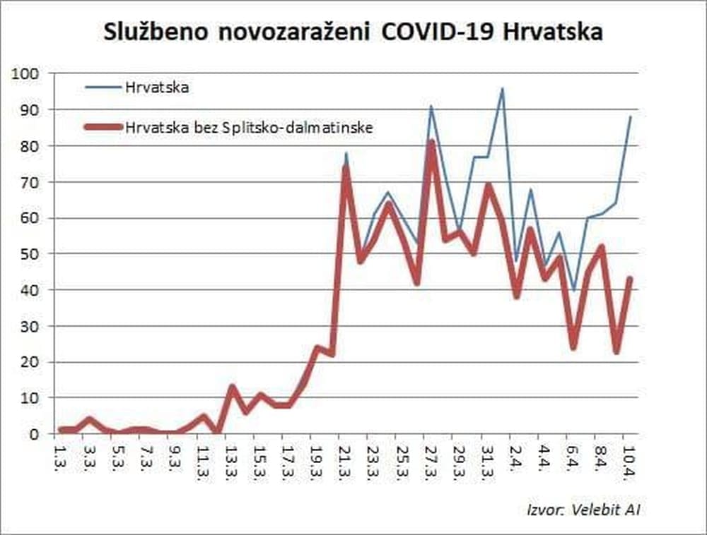 Do poražavajućih podataka dolazi se kada se uspoređuje broj oboljelih na razini Hrvatske i kada se toj statistici oduzme Splitsko-dalmatinska županija. Hrvatska je ušla u najkritičniju fazu borbe protiv Covida-19, od kojeg je oboljelo ukupno 1495 ljudi, uključujući 88 novih slučajeva. Da se u nacionalne podatke ne ubrajaju oni iz Splitsko-dalmatinske županije, broj novozaraženih u Hrvatskoj bi bio u padu.