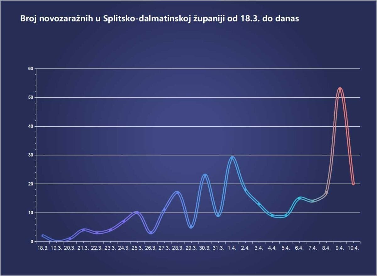 Kada se pogleda grafikon na stranici koja prati stanje zaraženih u Splitsko-dalmatinskoj županiji može se vidjeti da su tijekom četvrtka (9. travnja) evidentirana 53 novozaražena.
