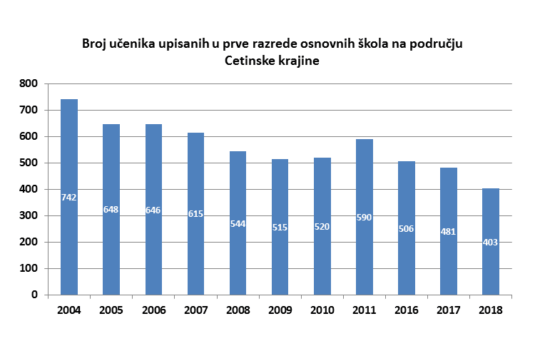 U novu školsku godinu 2018./2019. u prve razrede 10 osnovnih škola na području Cetinske krajine upisana su 403 učenika, što je 339 djece ili 13 razreda manje u odnosu na 2004./2005. kada je u prve razrede bilo upisano 742 djece.