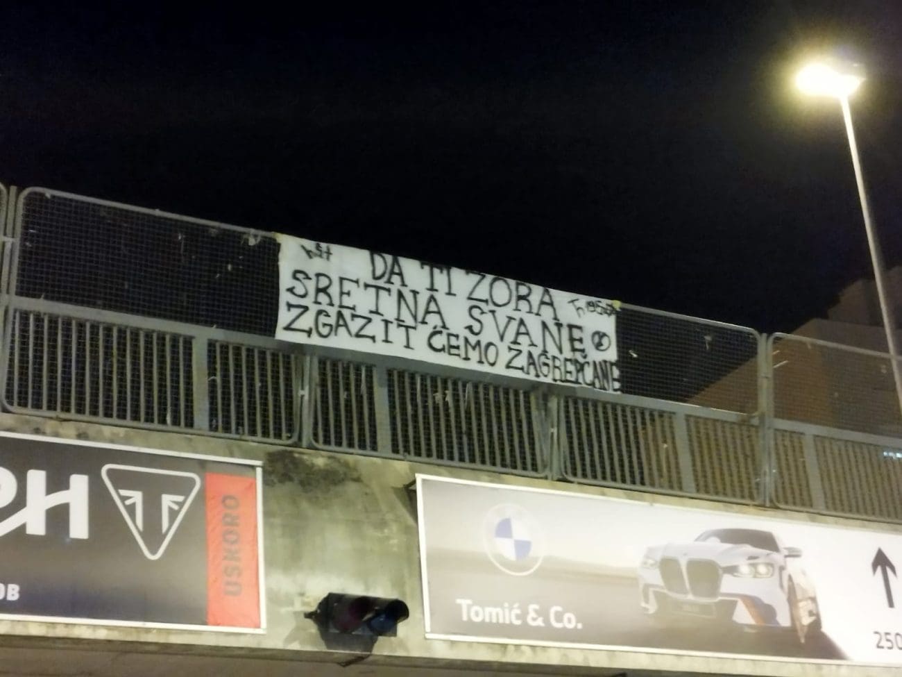 "Da ti zora sretna svane, zgazit ćemo Zagrepčane", piše na poruci koja je osvanula na mostu u Ulici Matice Hrvatske, odnosno iznad Dubrovačke ulice.