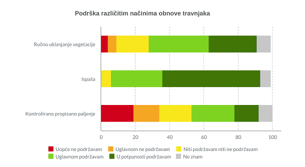 Koje metode su prihvatljive i najkorisnije u obnovi pojedinih travnjaka, pitanja su na koja će projektni tim uskoro dati odgovore i izraditi smjernice, no ako se pita ispitanike, oni podržavaju ispašu i ručno uklanjanje vegetacije, ali izražavaju negativan stav spram kontroliranog paljenja kojim bi se dinarski travnjaci oslobađali šikare. Ivan Budinski iz Udruge Biom komentirao je kako je ta negativna percepcija njemu dobro poznata i donekle razumljiva.