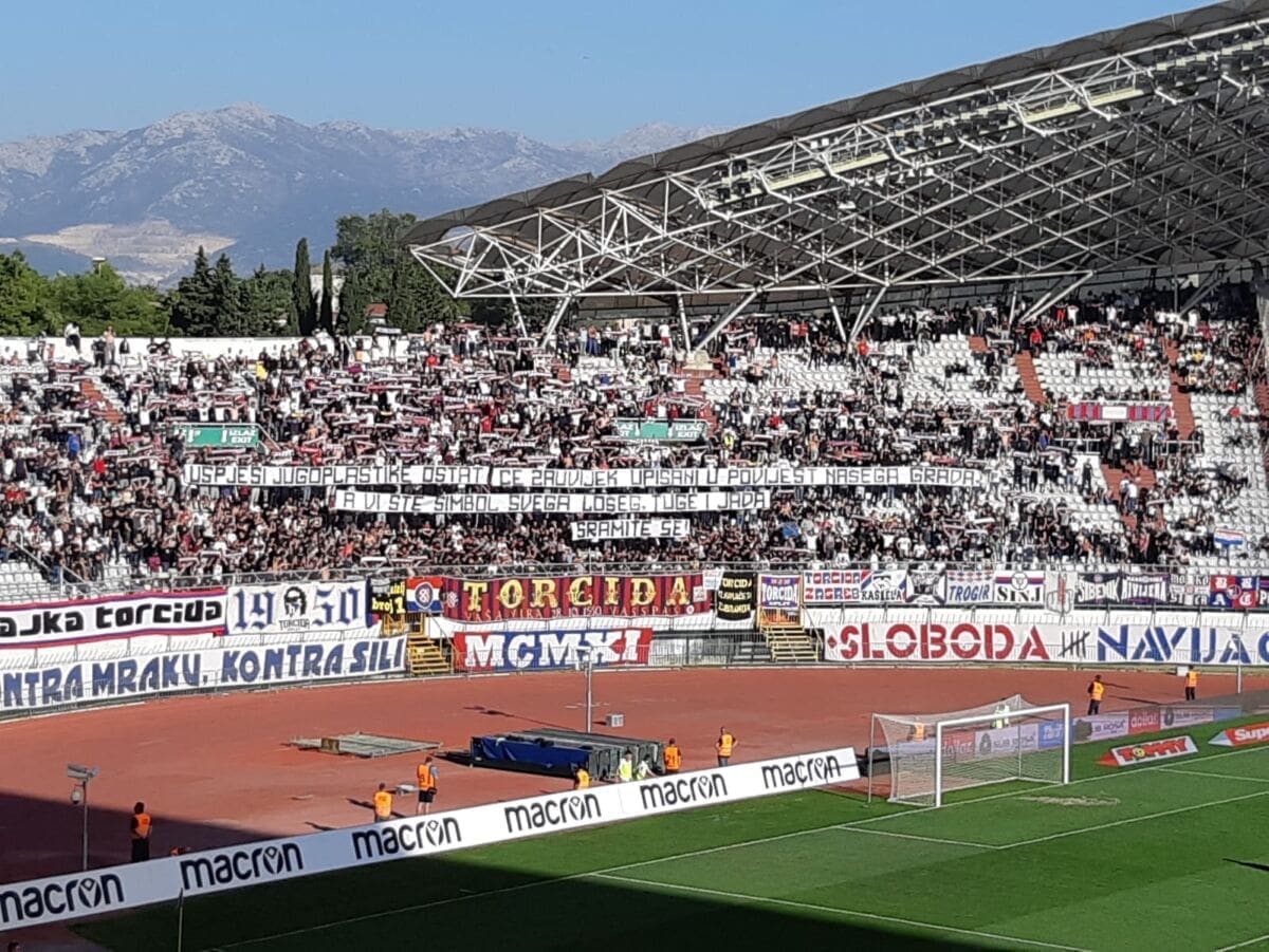 Torcida je pred kraj prvog poluvremena podigla transparent kojim je Gradu Splitu pokazala što misli o uklanjanju murala Jugoplastici u Dominisovoj.