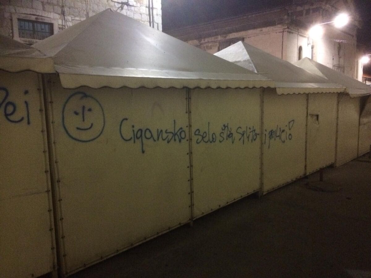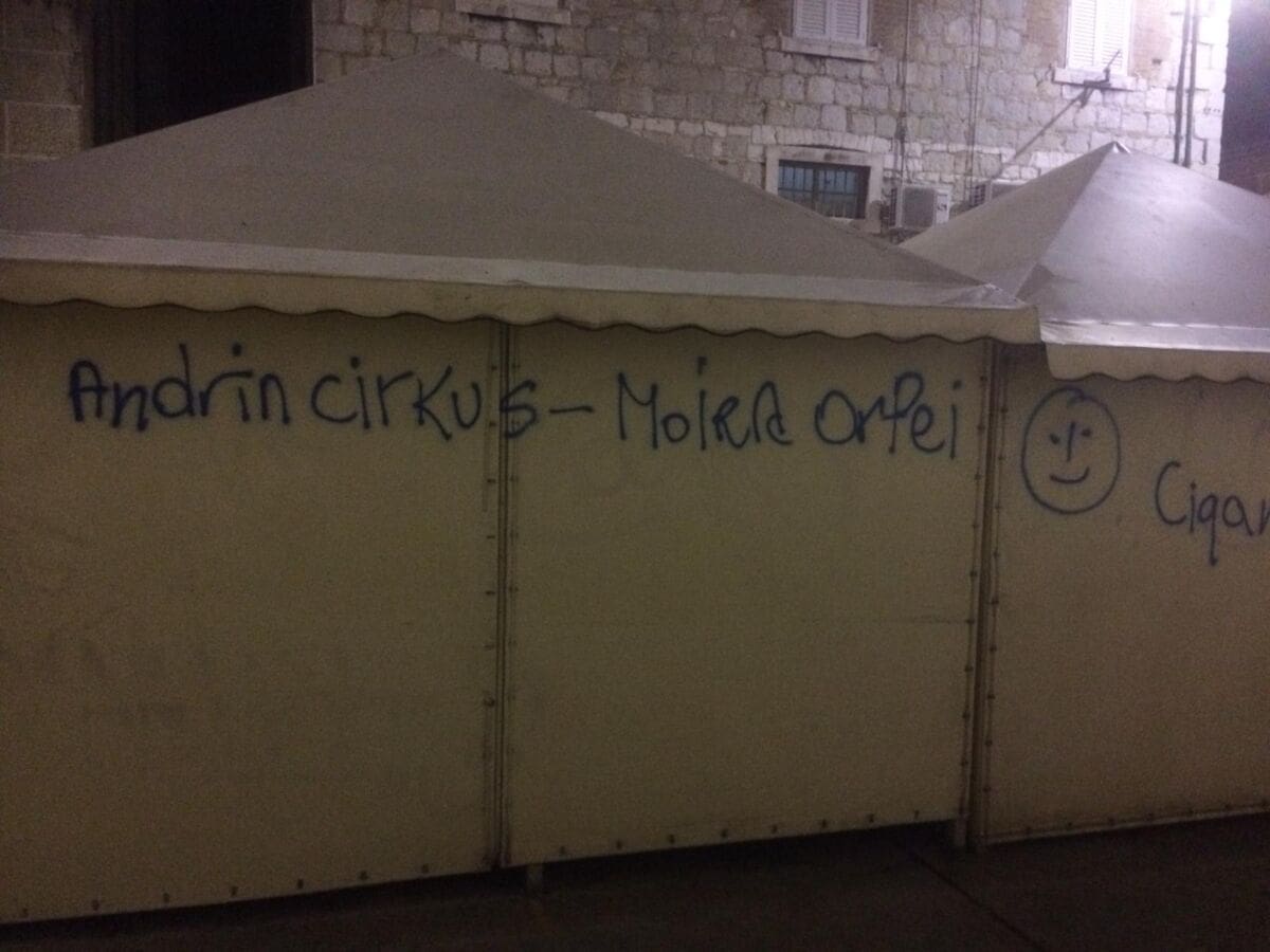 Na splitskom Pazaru noćas su ispisane poruke i grafiti upućeni gradonačelniku Andri Krstuloviću Opari, šefu komunalaca Damiru Babiću te koncesionaru Tržnici Hippos i članovima tog društva.