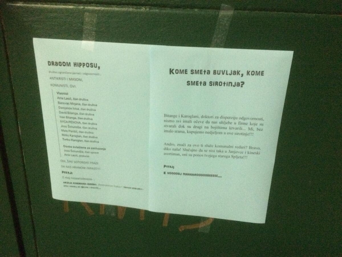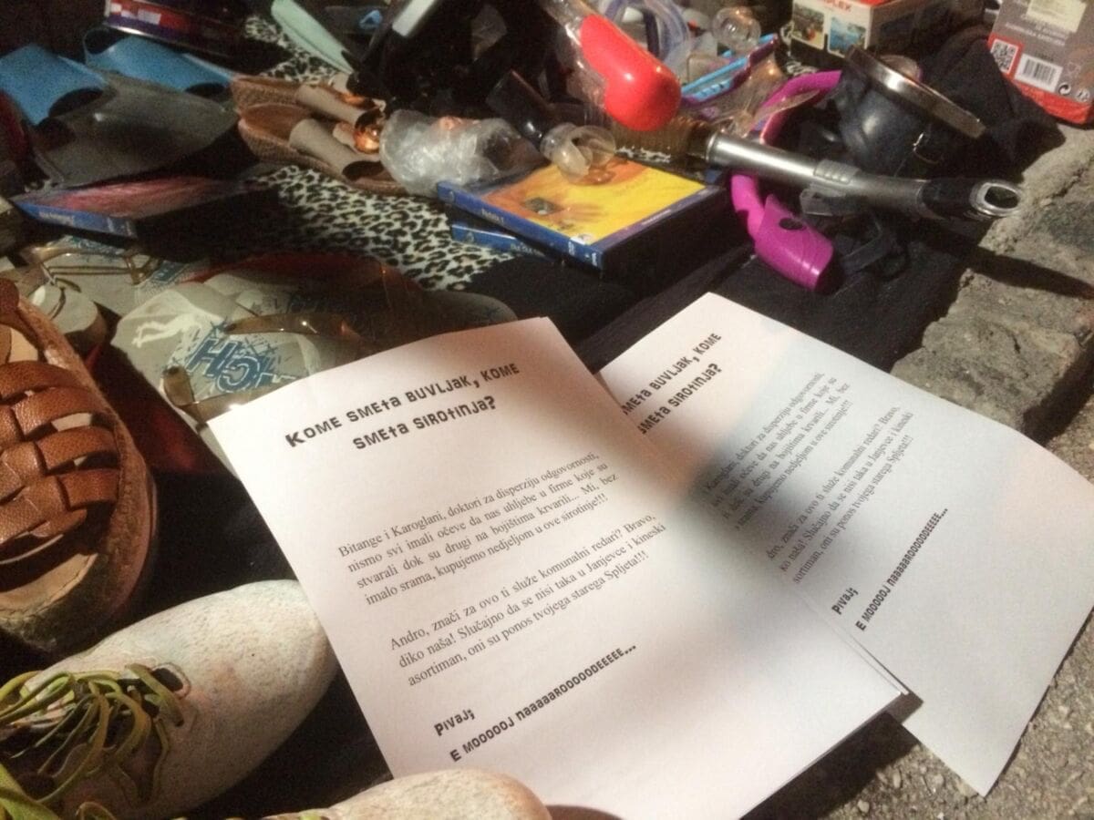 'Kome smeta buvljak, kome smeta sirotinja? Bitange i Karoglani, doktori za disperziju odgovornosti, nismo svi imali očeve da nas uhljebe u firme koje su stvarali dok su drugi na bojištima krvarili. Mi, bez imalo srama, kupujemo nedjeljom u ove sirotinje!!! Andro, znači za ovo ti služe komunalni redari? Bravo, diko naša! Slučajno da se nisi taka u Janjevce i kineski asortiman, oni su ponos tvojega starega Spljeta'.