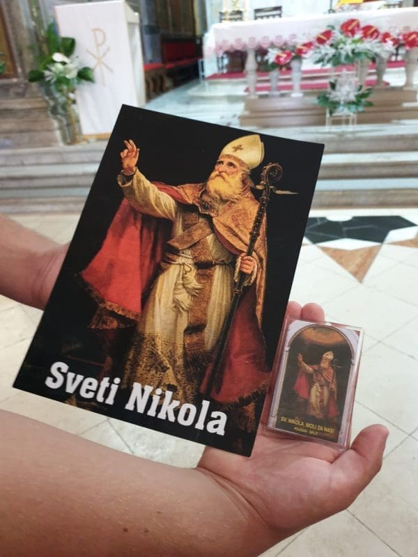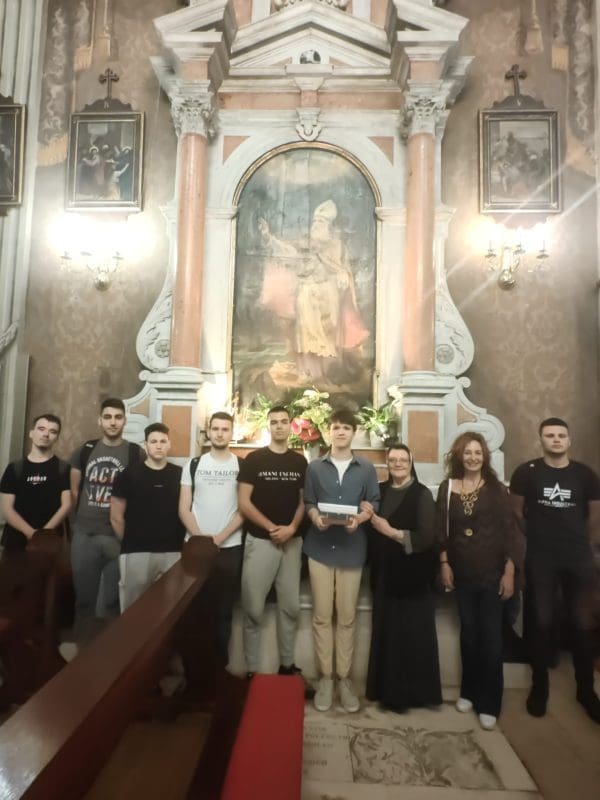 Maturanti ribarsko-nautičkog smjera i članovi nagrađivane eko grupe "Zdravo more" za kraj četverogodišnjeg školovanja još su jednom pokazali koliko su u obrazovnom sustavu jedinstveni. Oproštaj od razrednice i mentorice eko grupe, profesorice ribarsko-nautičke skupine predmeta Marijane De Marchi, školskih klupa i članstva u eko grupi samoinicijativno su odlučili obilježiti na poseban način: postavljanjem ručno izrađene zavjetne brodice "Zdravo more" pred sliku sv. Nikole u crkvi Gospe od Pojišana. Zaštitnik pomoraca i putnika na slici je prikazan u biskupskoj odjeći kako stoji na kamenoj hridi ispred uzburkanog mora po kojem plovi brod. Uzdignutom desnicom i pogleda uperenog u vis stišava nevrijeme i valove. Slika je potpisana i datirana (Antonio Zuccaro 1881. godine).