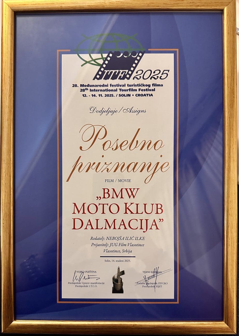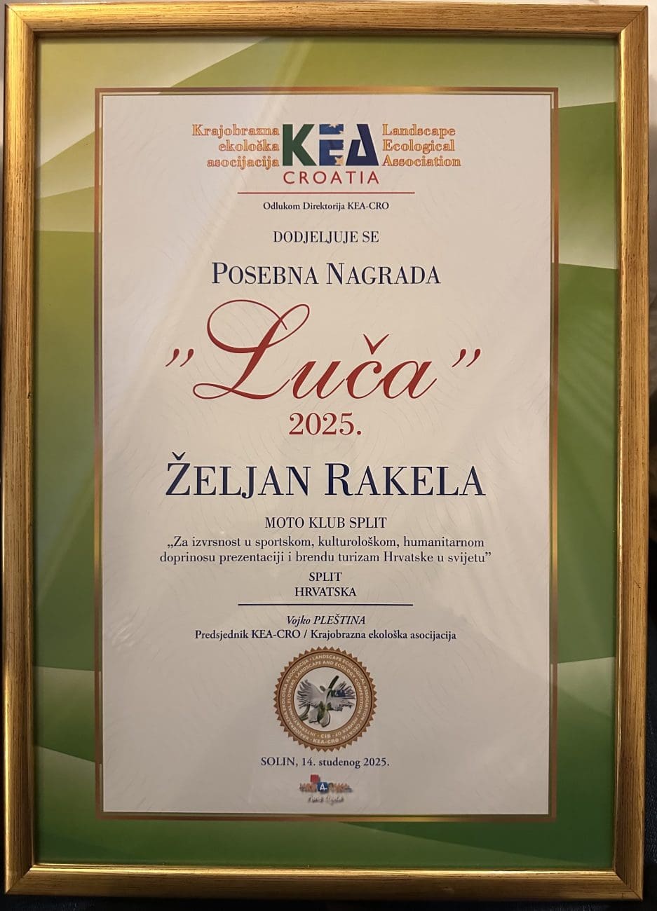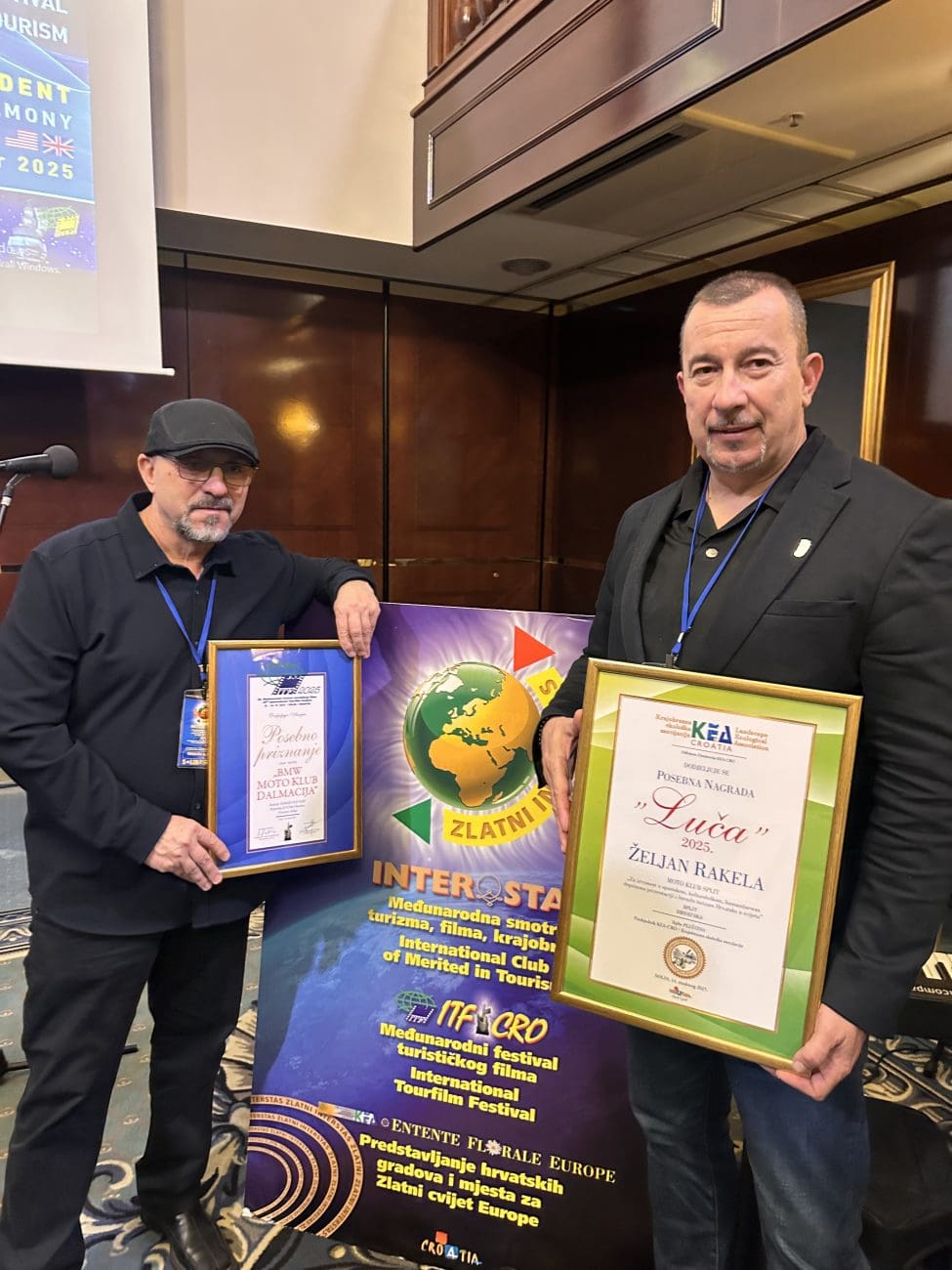Na 28. Međunarodnom festivalu turističkog filma ITF'CRO 2025, koji okuplja autore iz više od 130 zemalja svijeta, posebna nagrada "LUČA" dodijeljena je Željanu Rakeli iz BMW Moto Kluba Dalmacija.