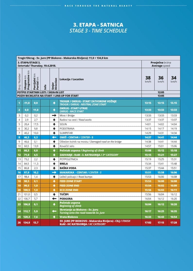 Dana 19. travnja 2018. na cestama Splitsko-dalmatinske županije vozit će se treća etapa međunarodne cestovne biciklističke utrke pod nazivom Tour of Croatia - race through the natural beauty, na kojoj će sudjelovati oko 200 biciklista, prateće službe i osiguranje, kroz etapu od Trogira do vrha Biokova - Sv.Jure prema itinereru: