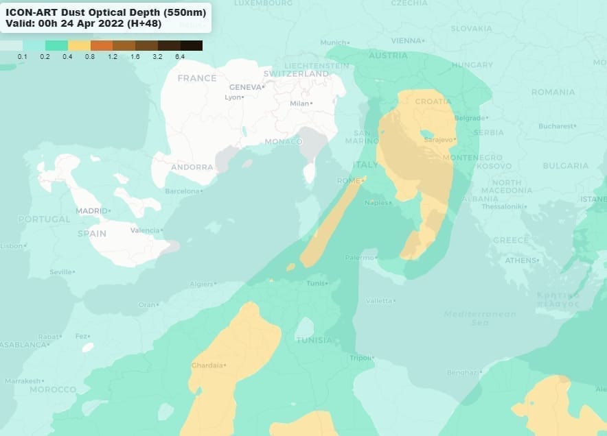 Modeli predviđaju vrhunac koncentracije pijeska u noći na nedjelju, a potom će se postupno smanjivati. S obzirom da će tijekom nedjelje biti povremene kiše, ona će ponovno sadržavati afrički pijesak.