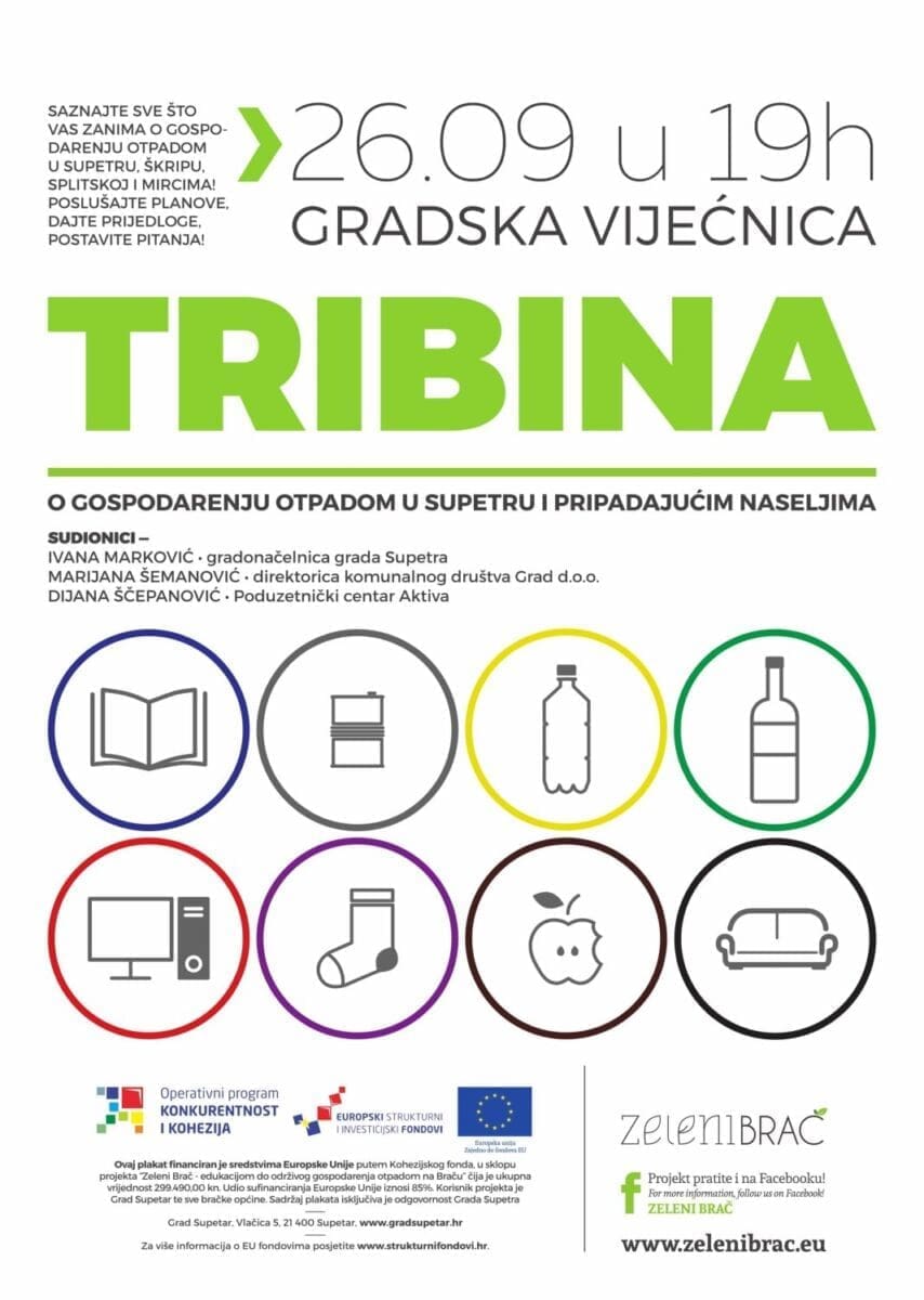 "Pozivamo sve zainteresirane da se dođu informirati te uključiti u raspravu o ovoj važnoj temi! Tribine se provode u sklopu projekta “Zeleni Brač - edukacijom do održivog gospodarenja otpadom na Braču”, koji zajednički provode Grad Supetar i sve bračke općine, a financira Europska Unija putem Kohezijskog fonda. Tribine će se održati u svim općinama na otoku, tako da će svi otočani imati priliku upitati svoje predstavnike jedinica lokalne samouprave, ali i komunalnih društava, sve što ih zanima o gospodarenju otpadom na Braču" - stoji u pozivu organizatora.