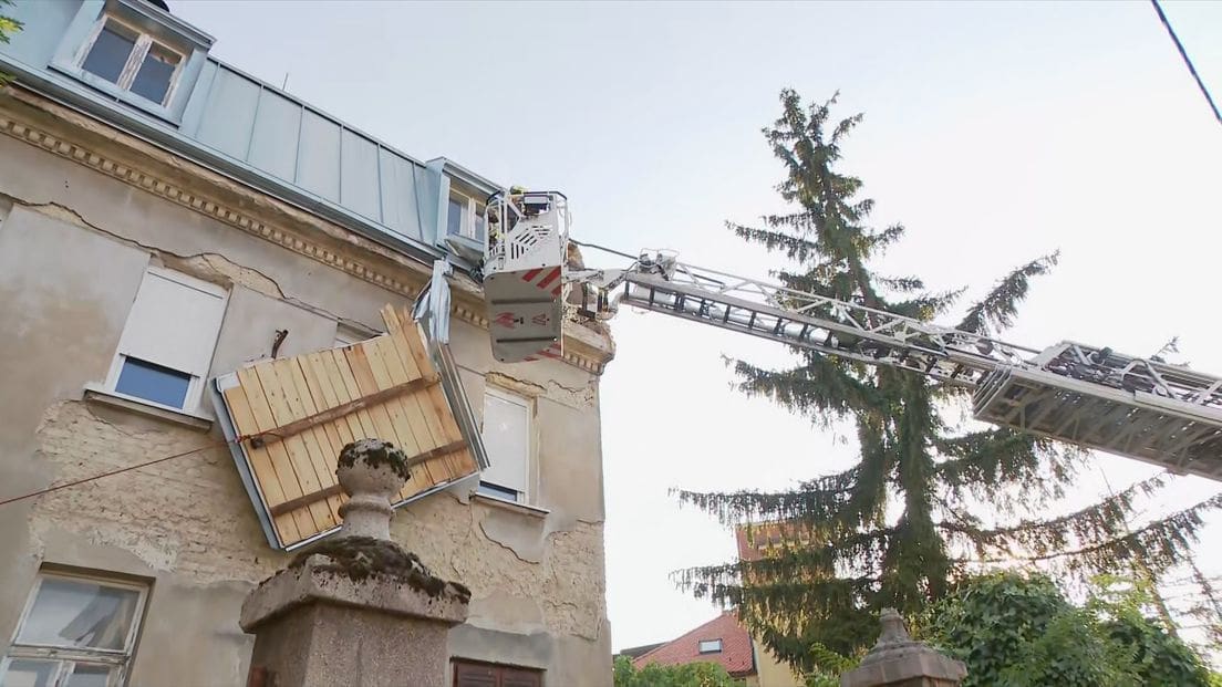Vatrogasci su snimljeni u Voćarskoj ulici u Zagrebu kako uklanjaju dijelove krova i saniraju krov kako ne bi prijetio stanovnicima, prolaznicima i automobilima.