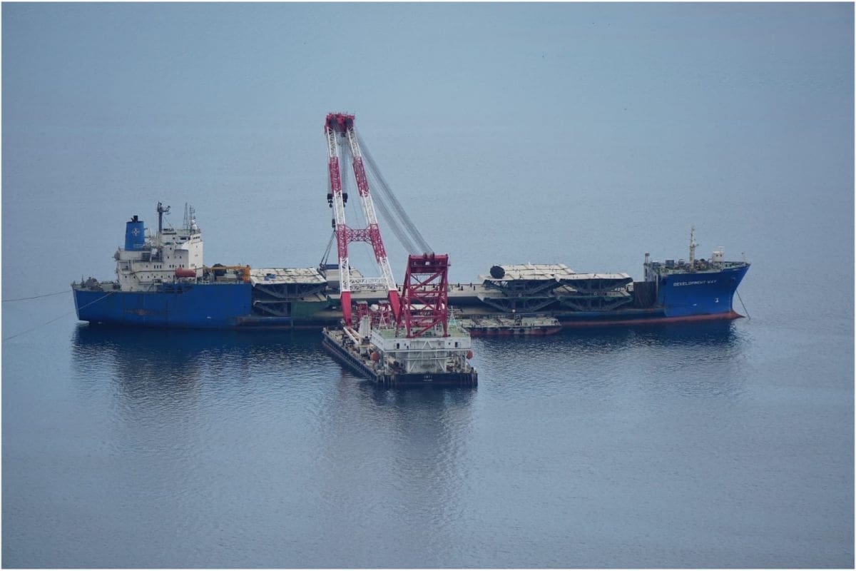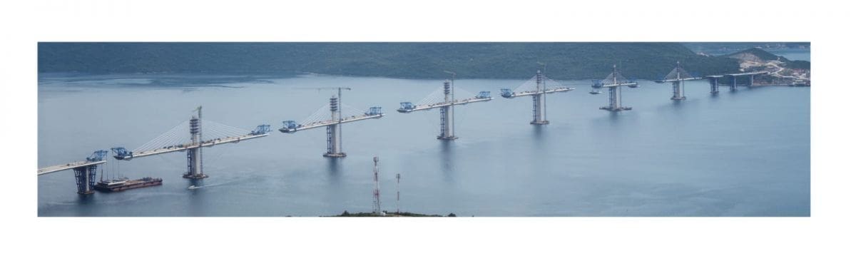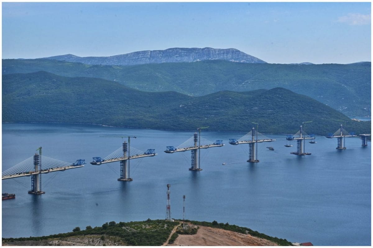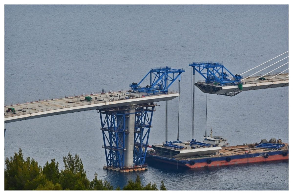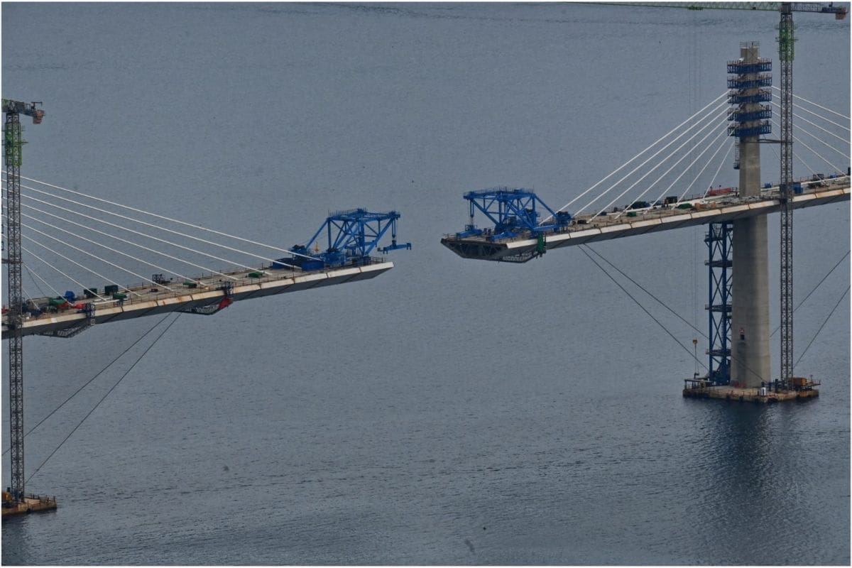 Brod "Development Way" iz Kine u utorak je dostavio posljednje dijelove konstrukcije Pelješkog mosta. Dosad je postavljeno 1.800 metara, što je 75 posto ukupne dužine mosta, a brodom su pristigla preostala 24 segmenta čelične rasponske konstrukcije mosta.