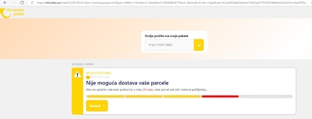 "Putem SMS poruka šire se lažne obavijesti s poveznicom u kojima se od korisnika traži uplata iznosa za isporuku pošiljke. Nemojte odgovarati na takve poruke ni otvarati poveznice koje se u njima nalaze jer se time izlažete riziku od krađe svojih podataka.