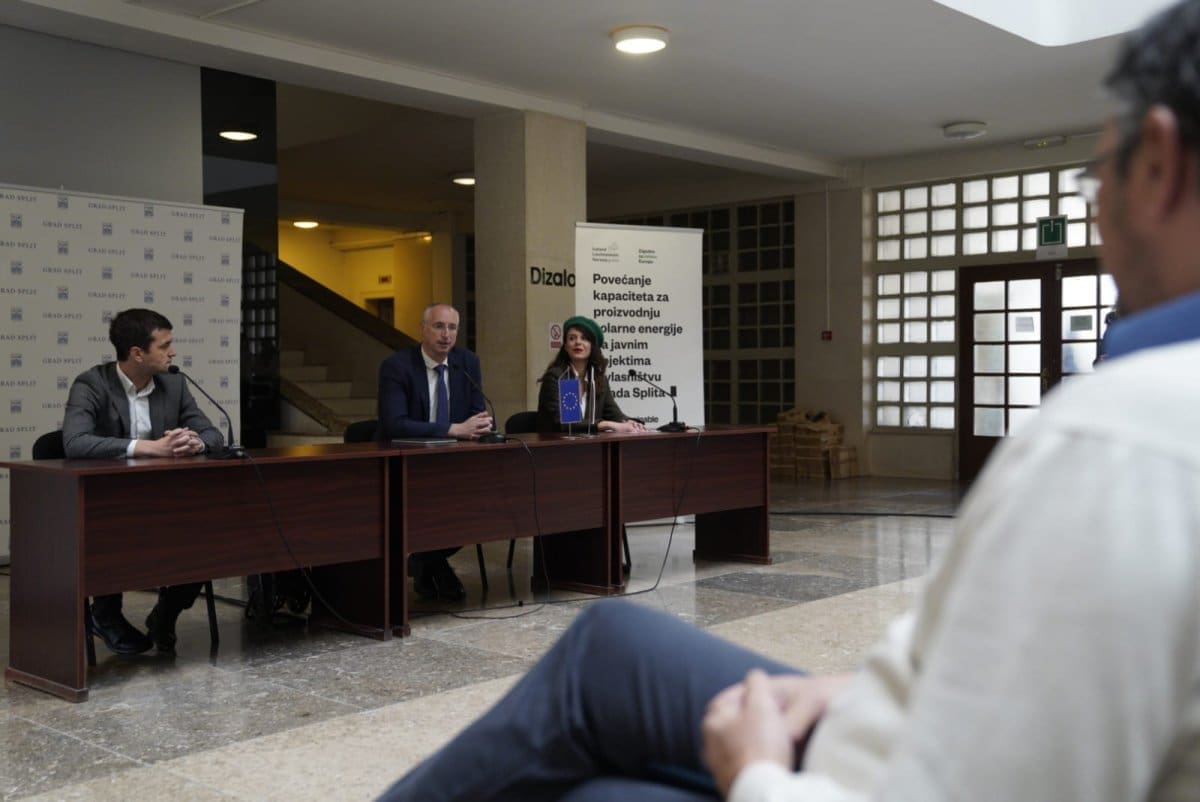 "Danas smo ovdje na početnoj konferenciji projekta kroz koji Grad Split postavlja 14 naponskih fotoćelija na javne objekte u vlasništvu Grada Splita, od čega je deset osnovnih škola, tri su vrtića i jedna sportska dvorana. Procjenjuje se da će na godišnjoj razini uštede na ovim objektima biti oko sto tisuća eura. Ovo je jedan pilot projekt koji obuhvaća dosada najveći broj zgrada u javnom vlasništvu. Ono što je do sada Grad Split napravio je da je također kroz fondove EU, kroz energetsku obnovu javnih zgrada ugradio solarne panele na tri osnovne škole, to su Skalice, Pojišan i Mertojak. Primjera radi, solarna elektrana na školi Mertojak mjesečno uštedi nekih 400 i nešto eura struje, što je pola računa struje koji ta škola ima. Želimo biti primjer kao grad, da koristimo taj solarni potencijal koji imamo, da počnemo od sebe, naših javnih objekata i da svojim primjerom i digitalnim alatima učinimo to dostupnim i našim građanima", kazala je Antonija Eremut Erceg, pročelnica Službe za razvoj grada.
