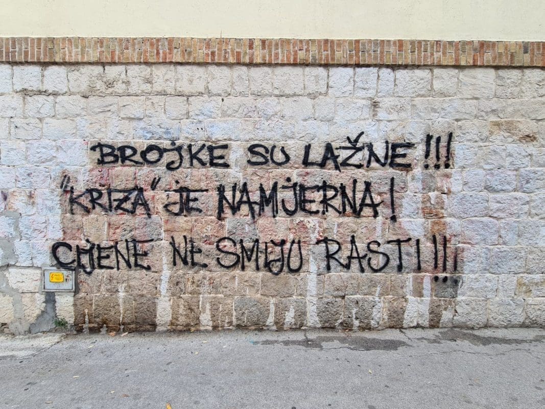 "Brojke su lažne!!! Kriza je namjerna! Cijene ne smiju rasti!!!" piše na zidu.