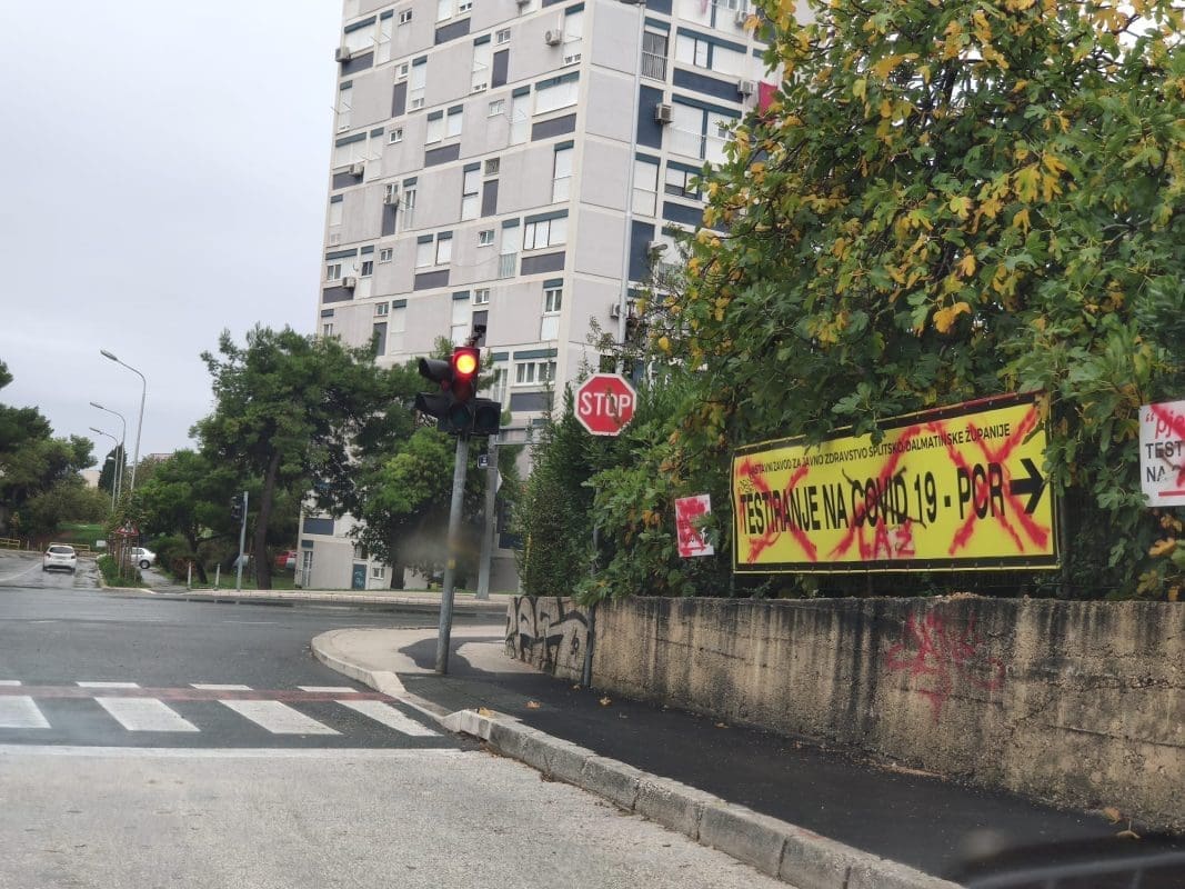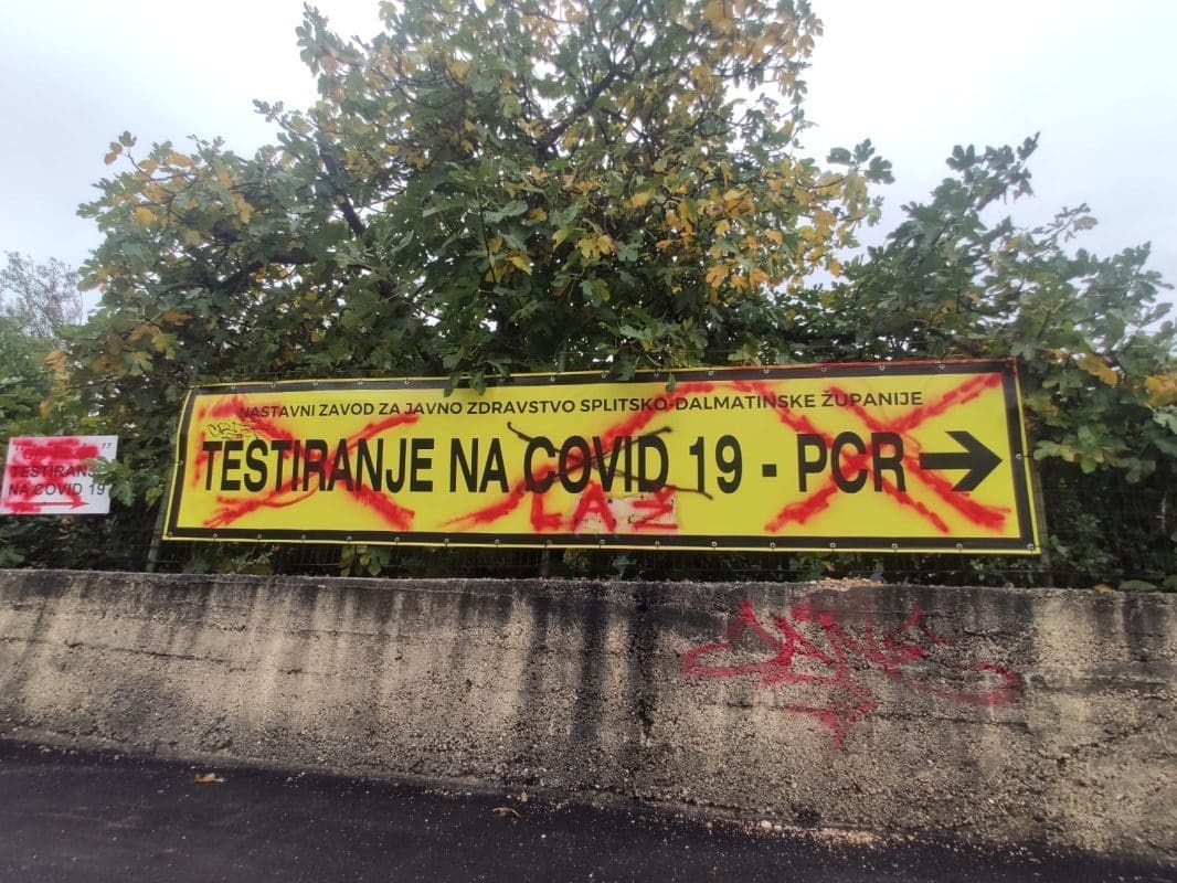 Već neko vrijeme, u blizini splitske Turske kule gdje se obavlja PCR testiranje na covid, natpis i putokaz ka lokaciji stoji prekrižen i devastiran, a netko je ispod nadopisao "laž".