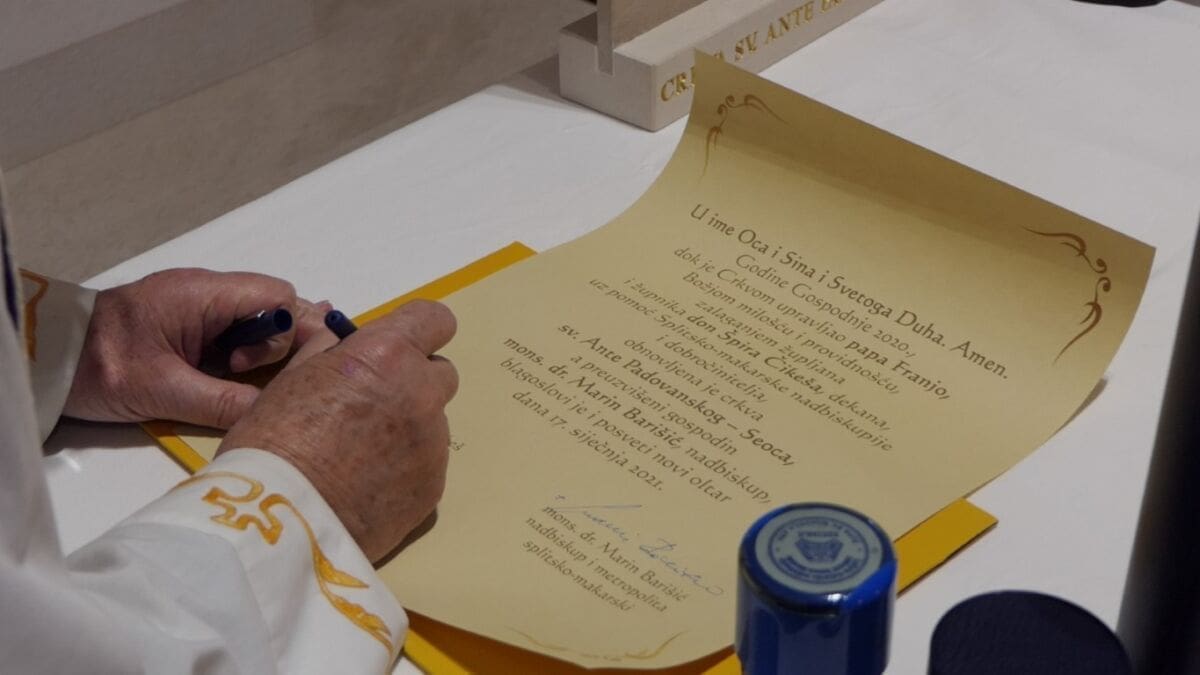 Na početku je nadbiskupa i sve nazočne uime župe pozdravila župljanka Ljubica Bogdanović. „Drago nam je da smo svako od nas na svoj način mogli dati svoj obol u gradnji crkve kao građevine u kojoj mi postajemo Crkva pisana velikim slovom. (…) Dok molimo za pokojne i zahvaljujemo Gospodinu za sve darovano, ujedno ponosno gledamo u diskretne elemente starohrvatskog crkvenog interijera. Kroz jednostavnost kamena, toplinu i boju drveta, sačuvanu tradiciju koja nas je oblikovala stvoren je dom naše zajedničke molitve“, kazala je, između ostaloga, gospođa Bogdanović.