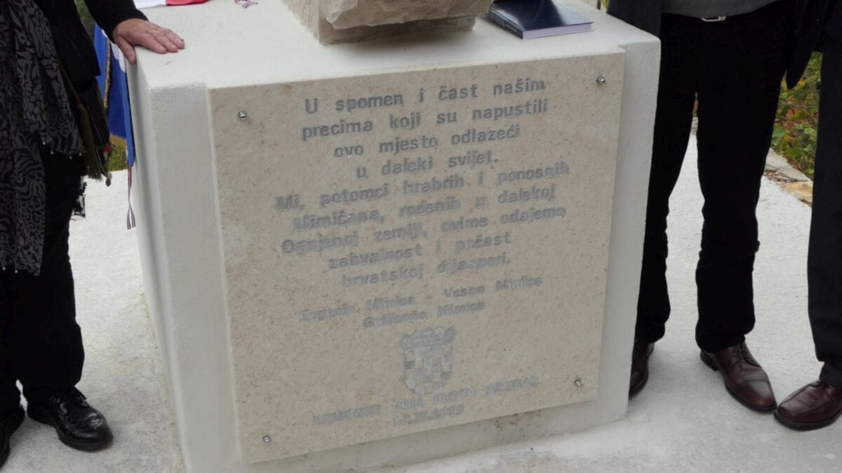 Na ploči piše "U spomen i čast našim predcima koji su napustili ovo mjesto, odlazeći u dalek svijet. Mi potomci hrabrih i ponosnih Mimičana, rođenih u dalekoj Ognjenoj zemlji ovime odajemo počast i zahvalnost hrvatskoj dijaspori".