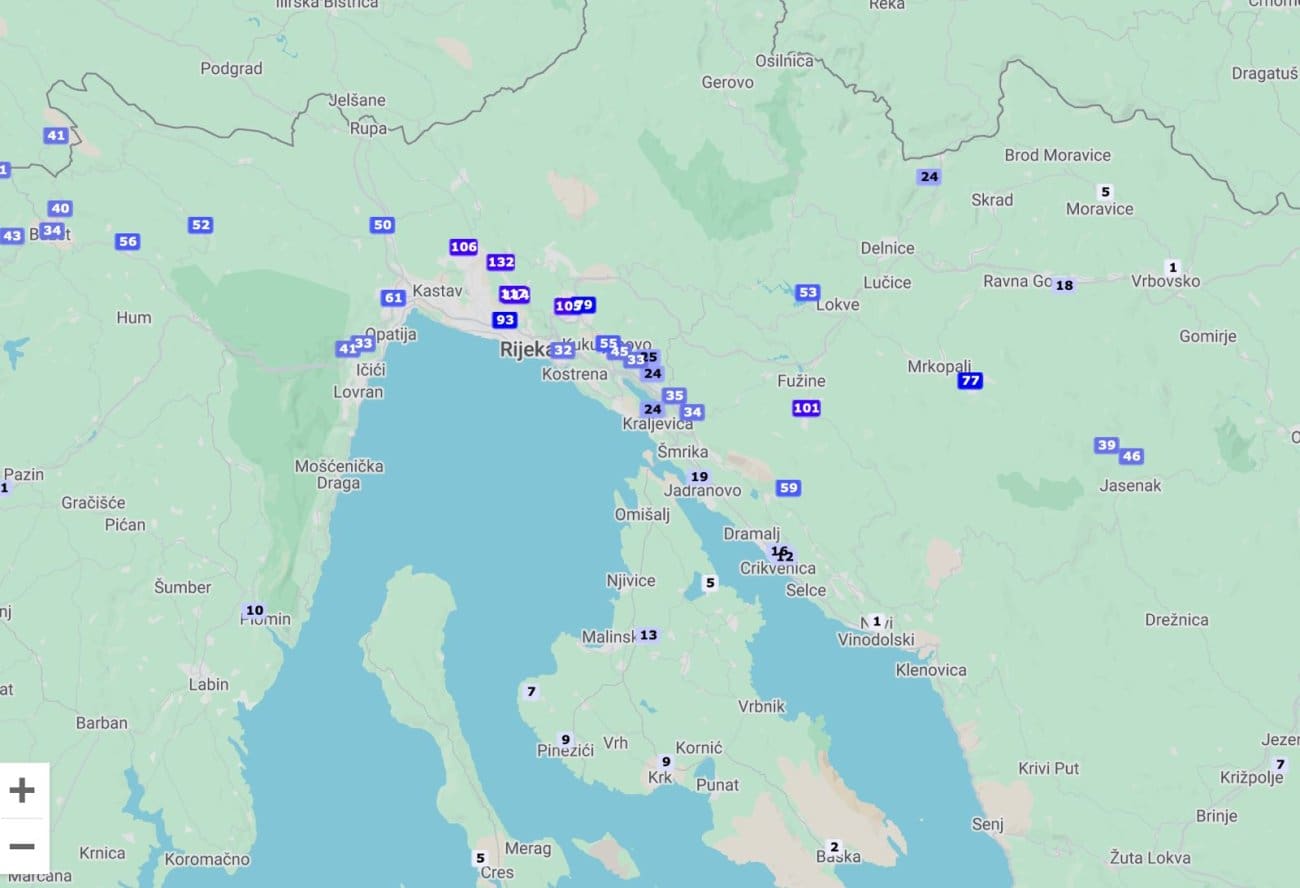 Rijeka, Podmurvice sa 96,2 l/m2 te Cernik s 83,6 l/m2 i Tuk Vojni sa 79,0 l/m2 također se ističu većim količinama kiše. Grižane, Bašunje (63,0 l/m2) i Pobri (61,7 l/m2) zabilježili su nešto manje, ali i dalje značajne oborine. Nešto ispod 60 litara po četvornome metru izmjereno je još u Kukuljanovu (58,9 l/m2), Roču (57,6 l/m2), Lokvama (53,5 l/m2), Lanišću (52,8 l/m2) i Brešcima (51,6 l/m2).