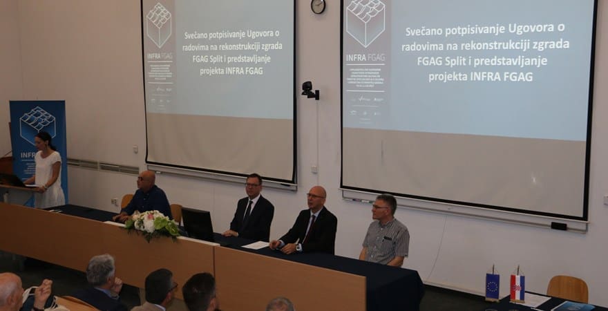 Svečano potpisivanje Ugovora o radovima na rekonstrukciji zgrada Fakulteta građevinarstva, arhitekture i geodezije u Splitu i predstavljanje EU projekta INFRA FGAG održano je u srijedu, 19. lipnja, u prostorijama Fakulteta.