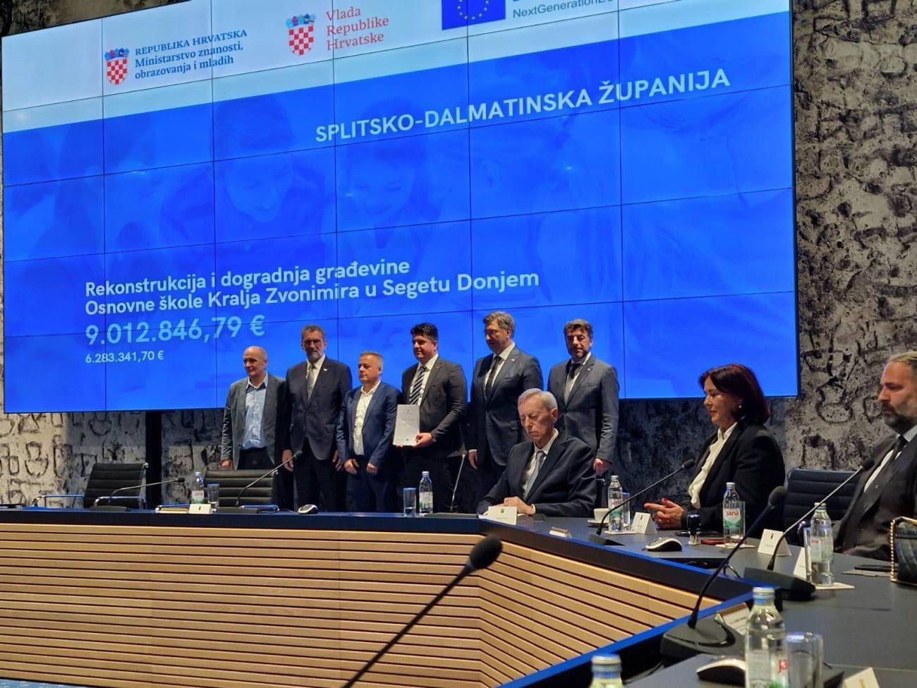 U prostorijama Nacionalne i sveučilišne knjižnice u Zagrebu danas je svečano potpisan i uručen ugovor za jedan od najvećih infrastrukturnih projekata na području Općine Seget – rekonstrukciju i dogradnju Osnovne škole Kralja Zvonimira u Segetu Donjem, uz izgradnju nove školske sportske dvorane.