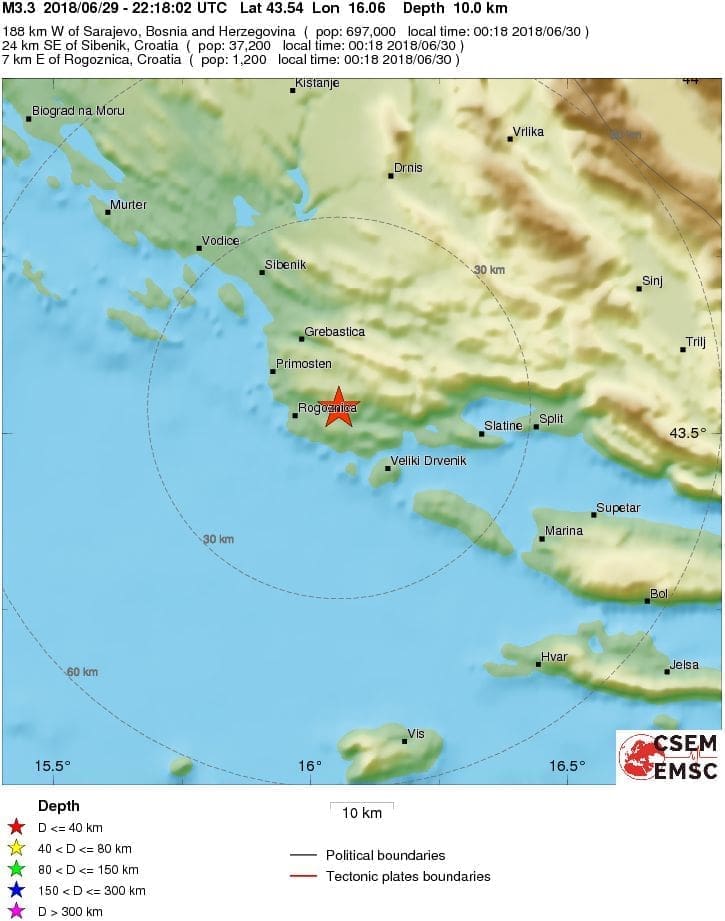 Seizmološka služba RH izvijestila je jutros da se 30. lipnja u 00:18 sati dogodio umjeren potres s epicentrom nedaleko Rogoznice magnitude 3.0 prema Richteru (IV stupnja makroseizmičke ljestvice).