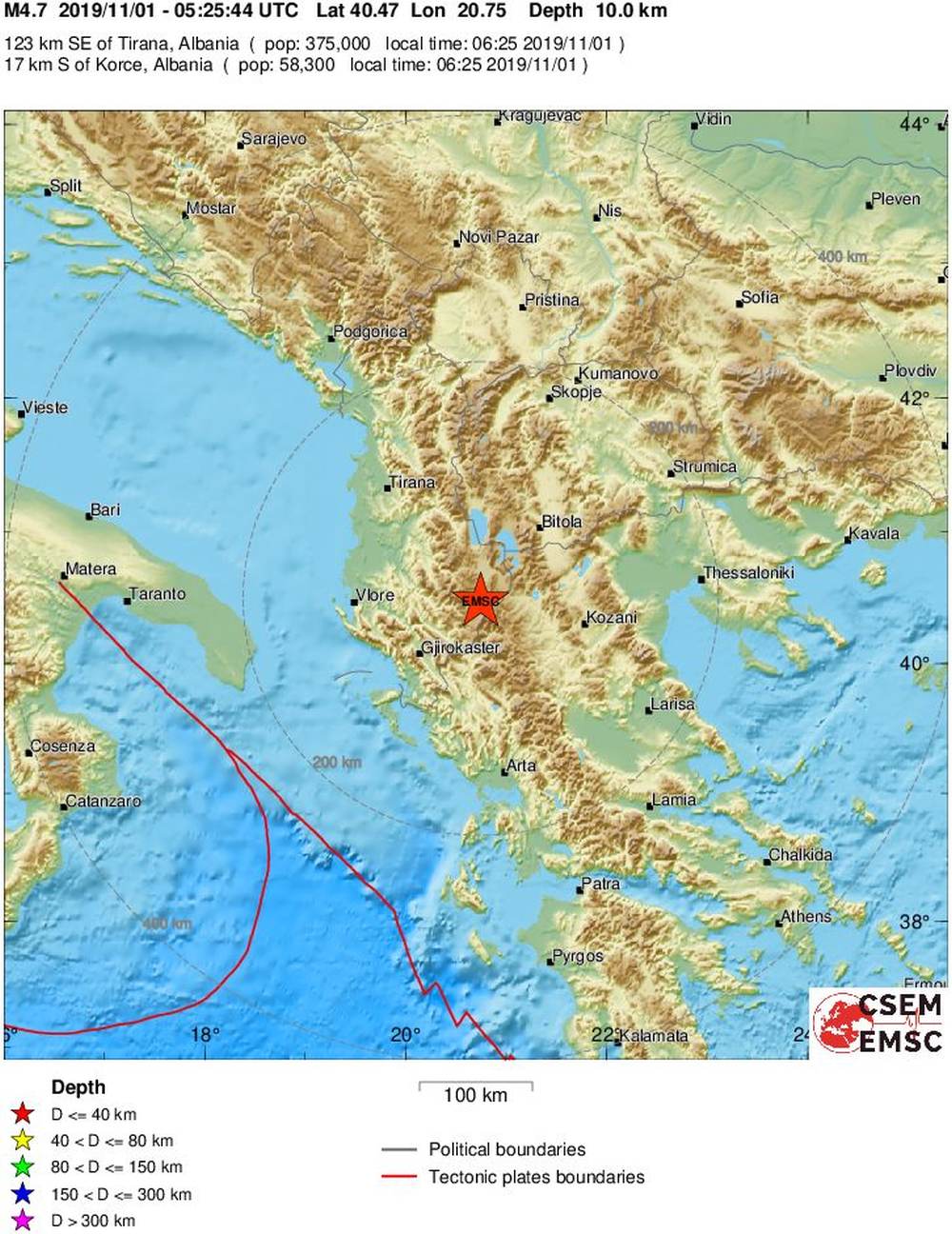 Jutros u 5:25 sati potres magnitude 4.7 stupnja pogodio je Albaniju, a osjetio se i u najjužnijim dijelovima Dalmacije. Epicentar je bio na dubini od 10 kilometara, 17 kilometara sjeverno od grada Korča, a 123 kilometra sjeveroistočno od Tirane.