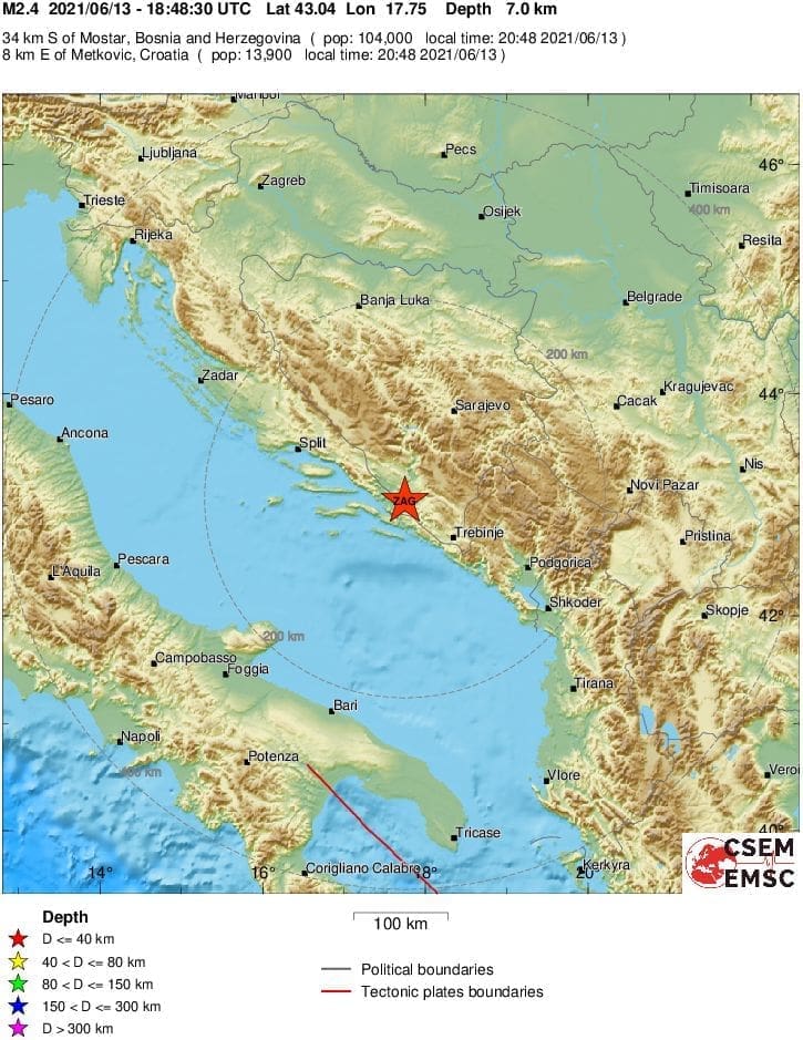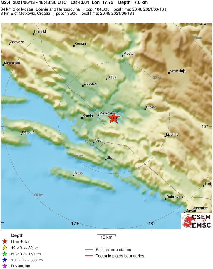 Prema podacima EMSC-a, magnituda potresa je iznosila 2.4 prema Richteru, a epicentar je bio 8 kilometara istočno od Metkovića.