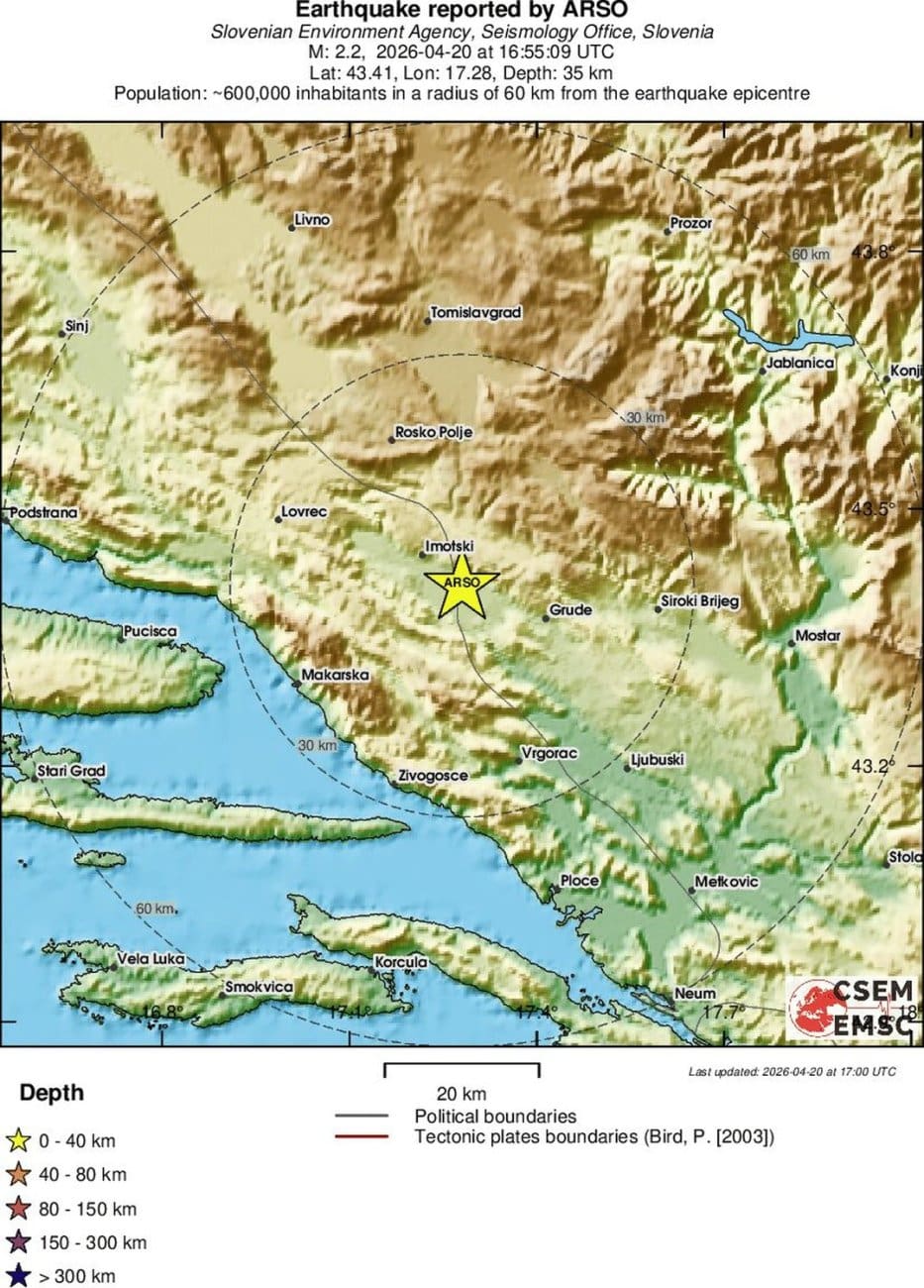 Prema podacima EMSC-a slab potres se u 18 sati i 55 minuta dogodio na pograničnom području između BiH i Hrvatske.