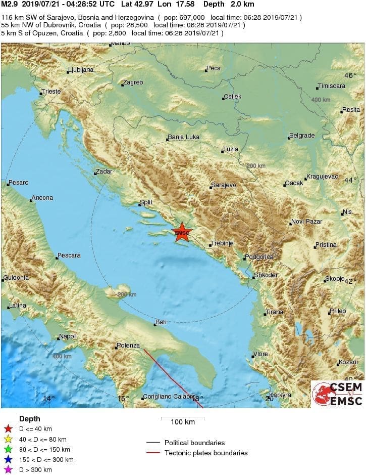 Jutros u 6 sati i 28 minuta dogodio se potres s epicentrom u dolini Neretve. Prema informacijama EMSC-a, potres je bio jačine 2,9 stupnjeva po Richteru.