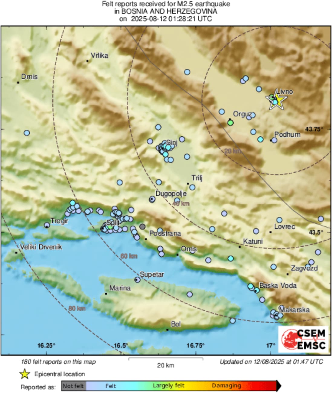 Prošle noći u 3 sata i 28 minuta nakon ponoći zatreslo se pogranično područje između Hrvatske i Bosne i Hercegovine. Prema podacima EMSC-a, slabiji potres magnitude 2.5 po Richteru dogodio se kilometar jugoistočno od Livna, odnosno. 58 kilometara sjeveroistočno od Splita.