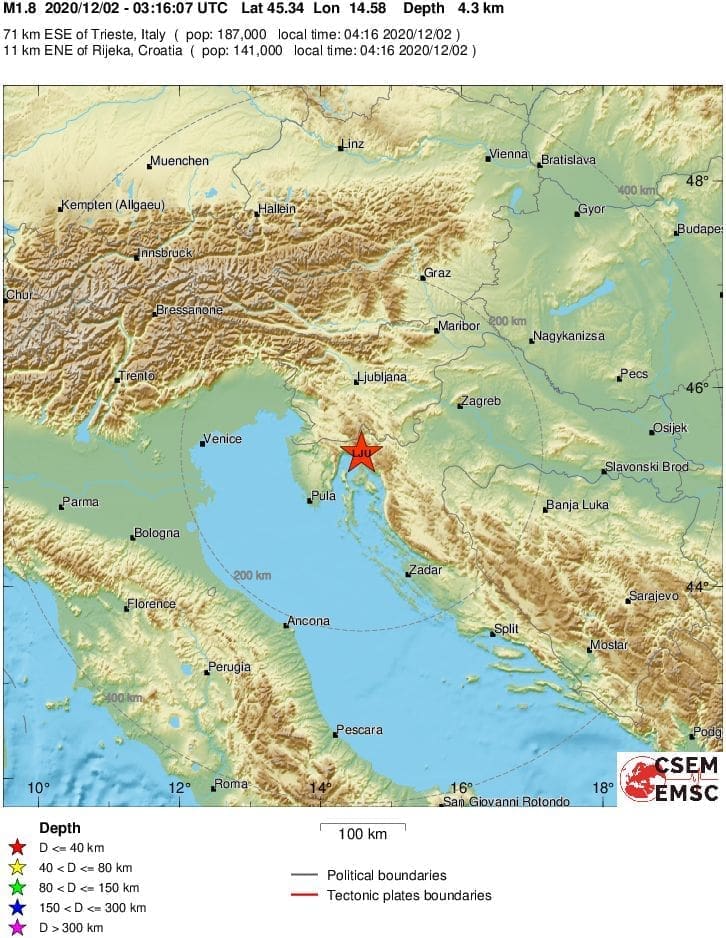 Slabiji potres noćas u 4 sata i 16 minuta dogodio se na Kvarneru. Magnituda mu je bila 1.8 po Richteru, a epicentar 11 kilometara istok-sjeveroistočno od Rijeke. Dubina potresa bila je 4 kilometra.