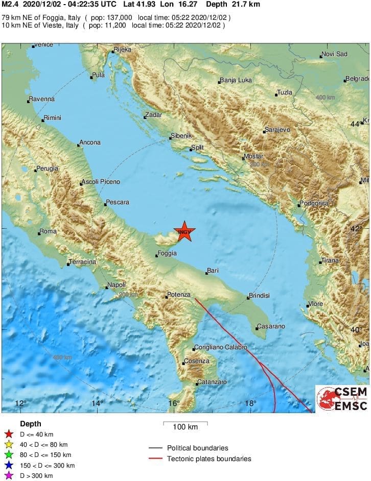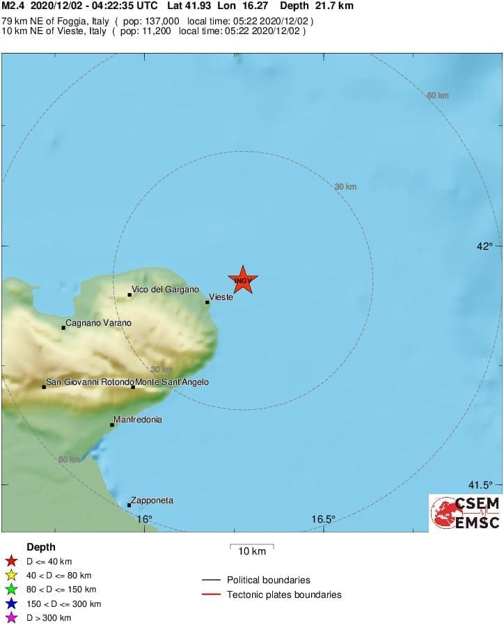 Prema podacima EMSC-a, magnituda potresa bila je 2.4 po Richteru, a epicentar 10 kilometara sjeveroistočno od mjesta Vieste na talijanskom poluotoku Gargano.