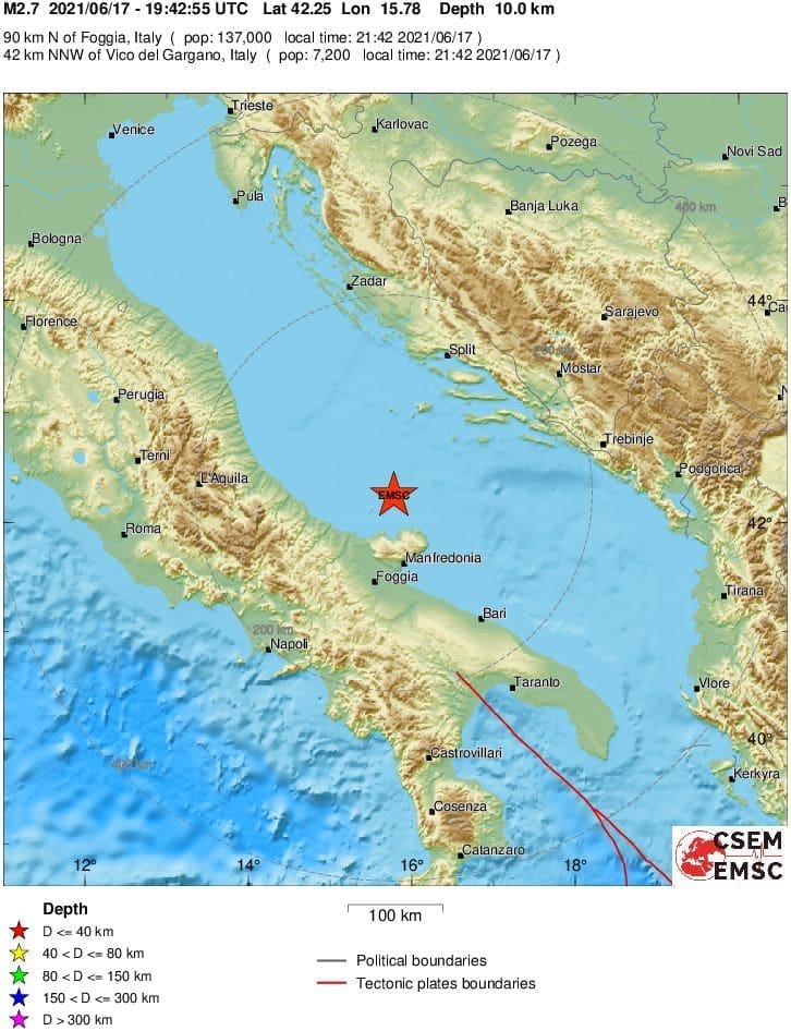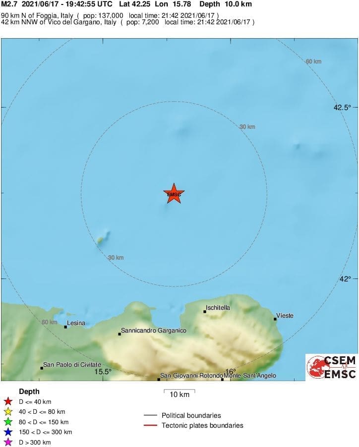 Prema podacima EMSC-a, magnituda potresa je iznosila 2.7 prema Richteru, a epicentar je bio 42 kilometra sjeverozapadno od gradića Vico del Gargano.