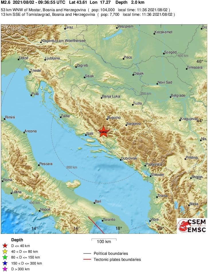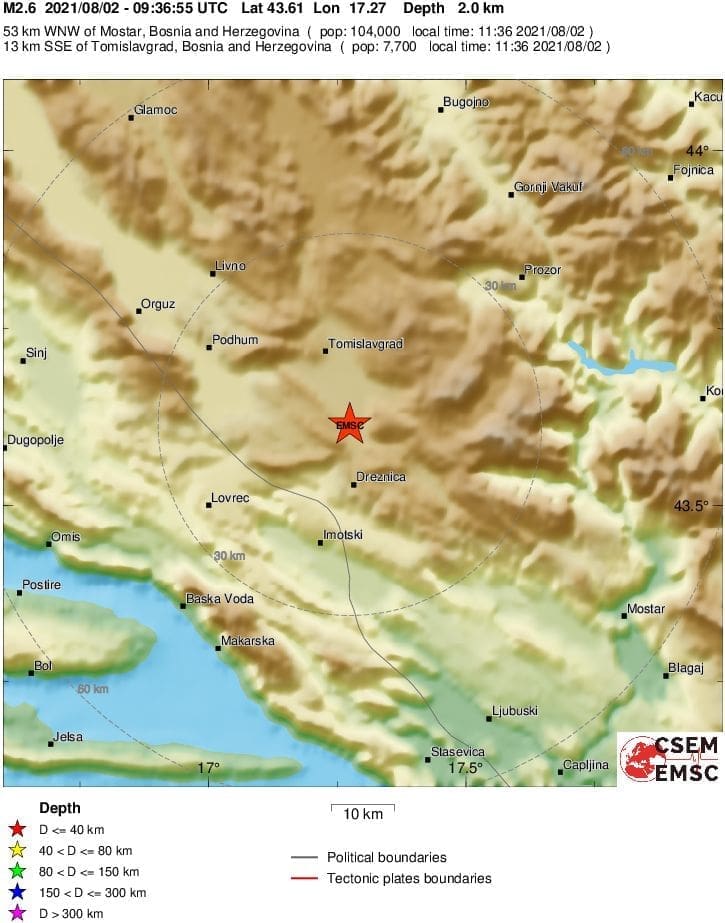Prema podacima EMSC-a, magnituda potresa iznosila je 2.6 prema Richteru, a epicentar je bio 13 kilometara jug-jugoistočno od Tomislavgrada.