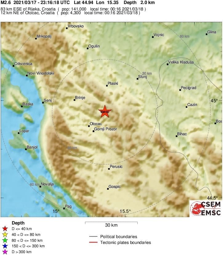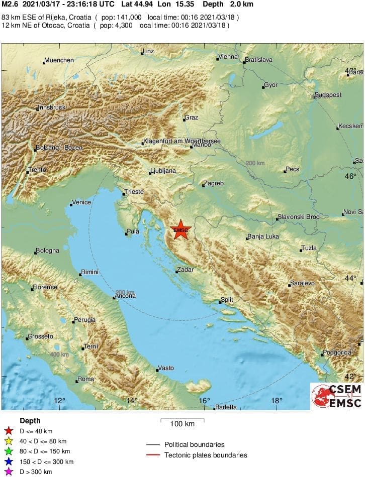 Prema podacima EMSC-a, magnituda potresa je iznosila 2.6 prema Richteru, a epicentar je bio 12 kilometara sjeveroistočno od Otočca.