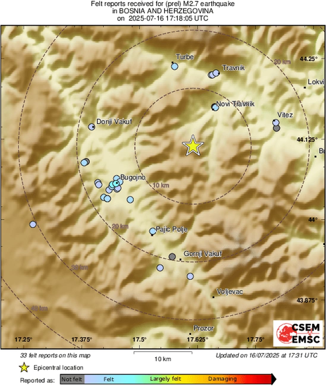 Prema podacima Europskog mediteranskog seizmološkog centra (EMSC), u srijedu 16. srpnja 2025.u 19:18 sati po lokalnom vremenu zabilježen je potres magnitude 2.7 po Richteru na području središnje Bosne i Hercegovine.