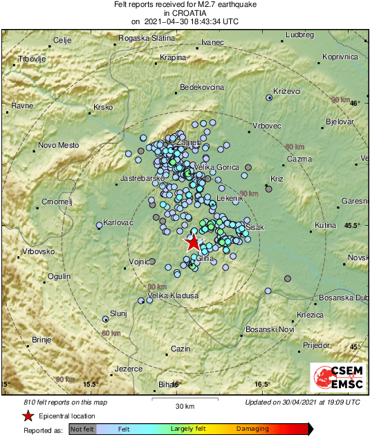 M2.7 #earthquake (#potres) strikes 22 km W of #Sisak (#Croatia) 16 min ago. Updated map of its effects: pic.twitter.com/Om7MeJJnaa
