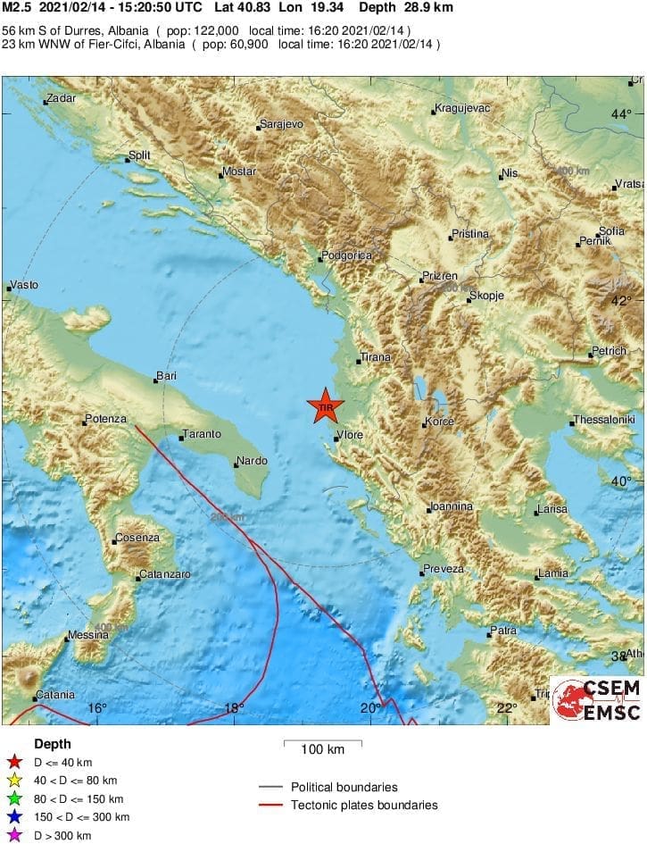 Magnituda potresa je bila 2.5, a epicentar 23 kilometra ZSZ od grada Fier-Çifçi.