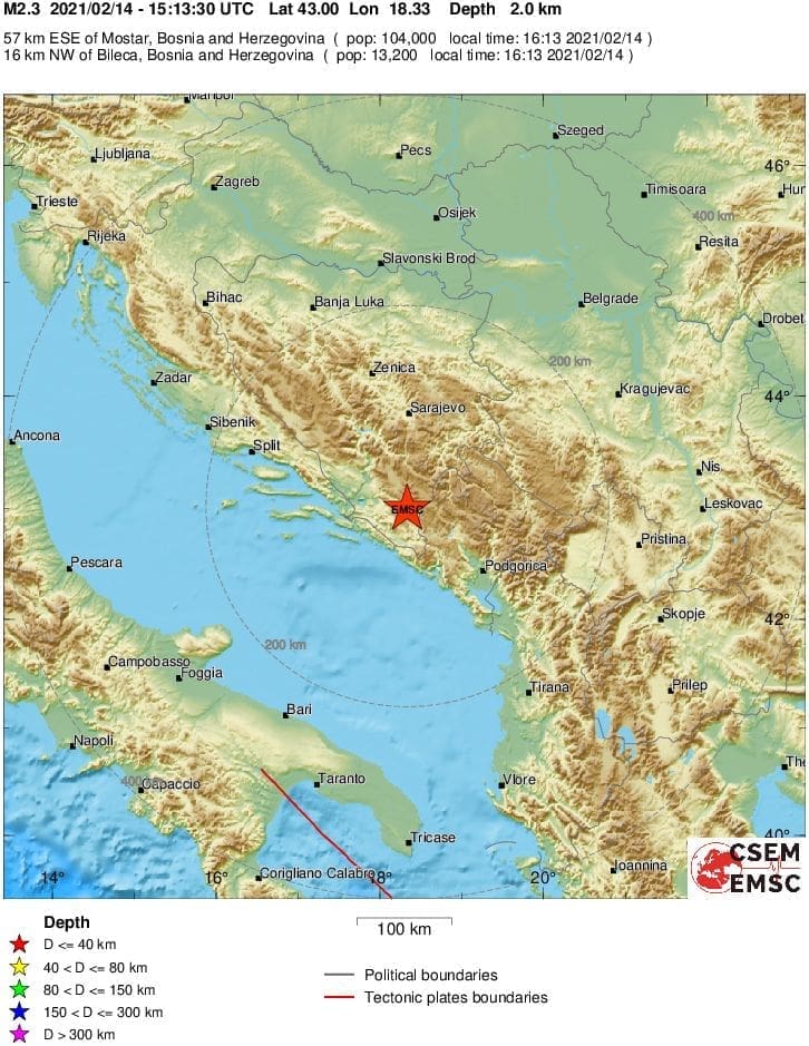 Prema podacima EMSC-a magnituda mu je bila 2.3 prema Richteru, a epicentar 16 kilometara sjeverozapadno od Bileće.