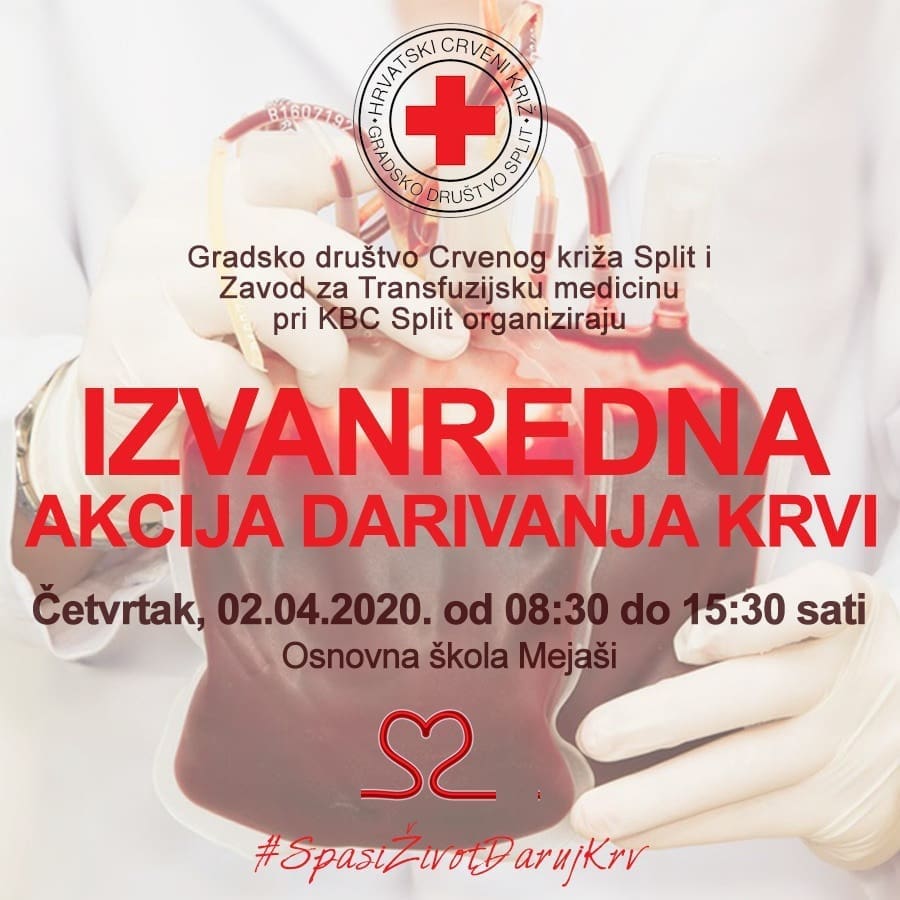 Zbog povećanih potreba za dozama krvi, Gradsko društvo Crvenog križa Split u suradnji sa Zavodom za transfuzijsku medicinu pri KBC Split organizira IZVANREDNU AKCIJU DARIVANJA KRVI.
