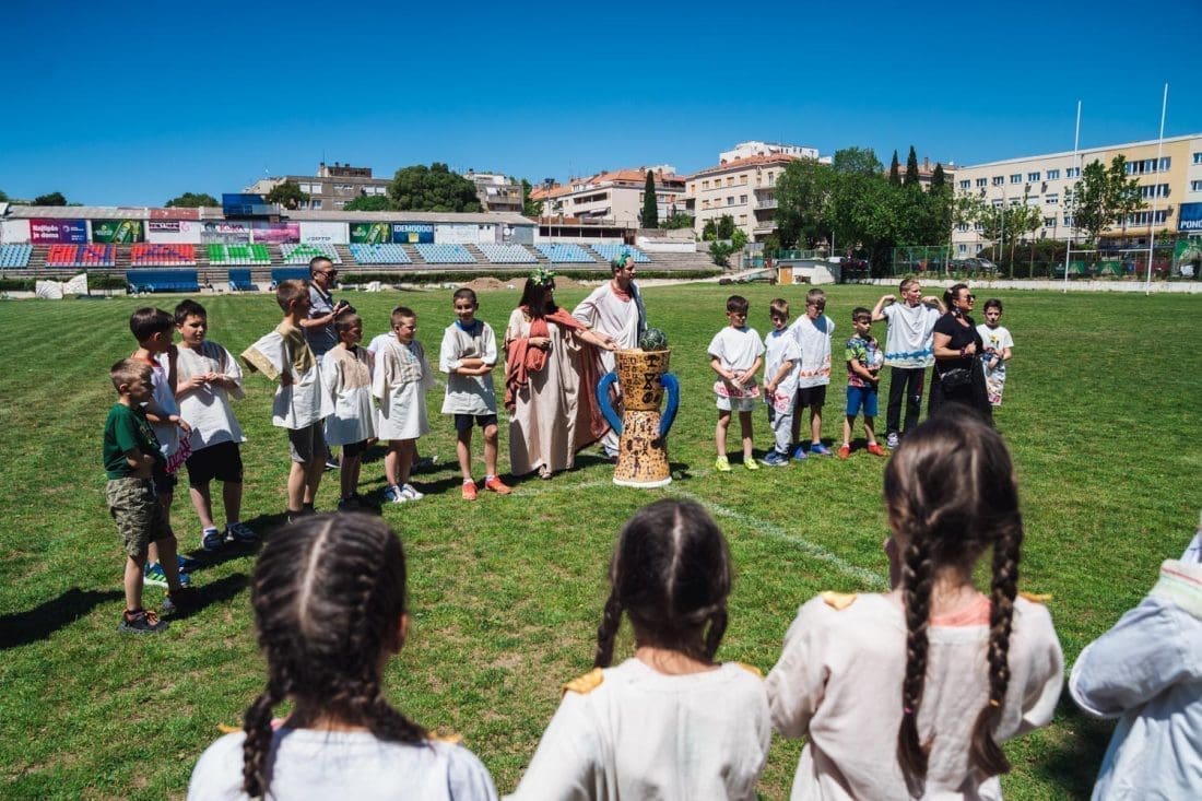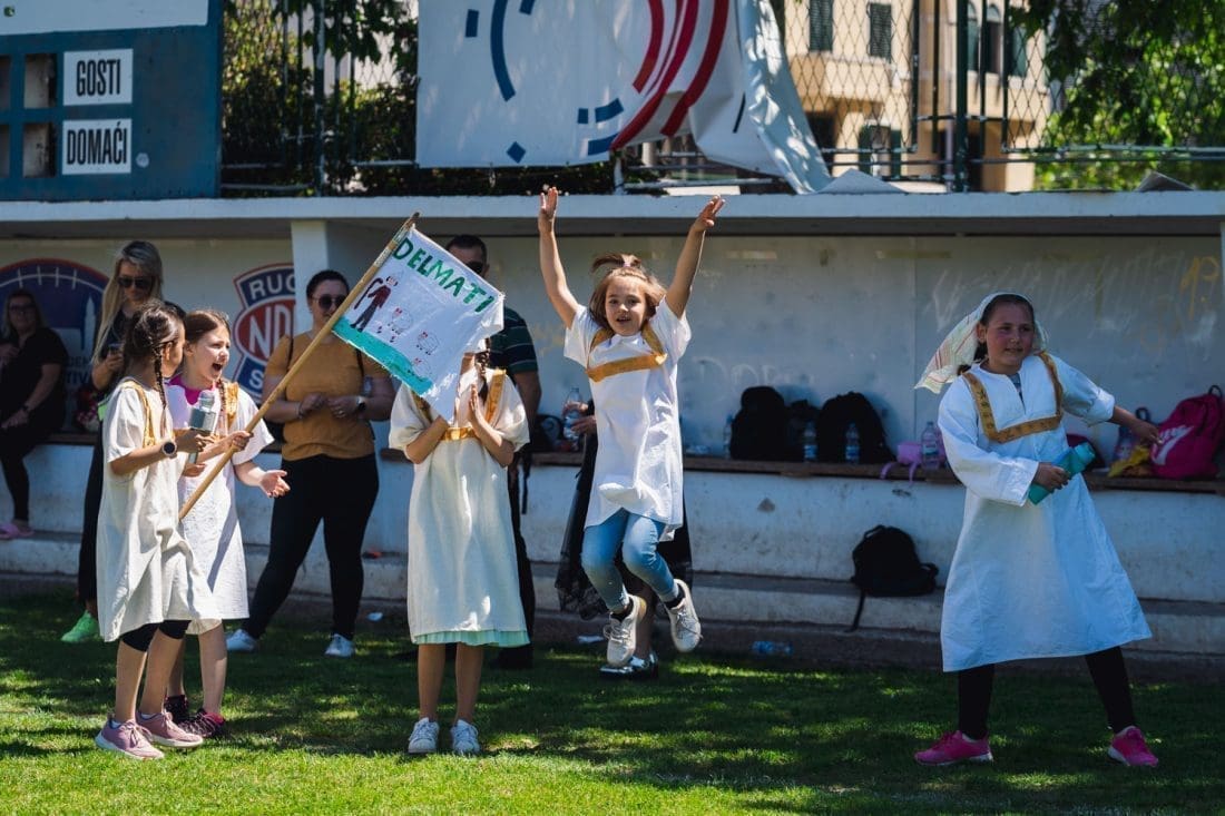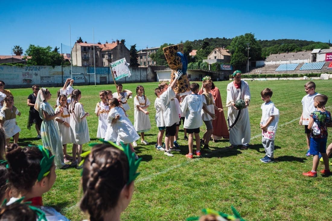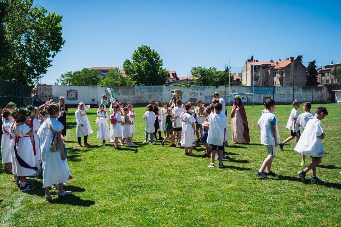 Zajedno sa svojim prijateljima Rimljanima iz 3.a i 3.b razreda OŠ Pujanki, u pratnji učiteljica, krenuli su kroz centar grada, preko Peristila, kroz Podrume pa do na Rivu. Svako malo su zastajali jer su znatiželjni turisti, ali i domaći, htjeli znati o čemu je riječ i fotografirati se sa zbilja sjajno kostimiranom djecom. Vesela povorka je potom s Rive krenula prema Starom placu gdje su ih dočekali predstavnici Ragbi kluba „Nada“ koji su im velikodušno ustupili teren.
