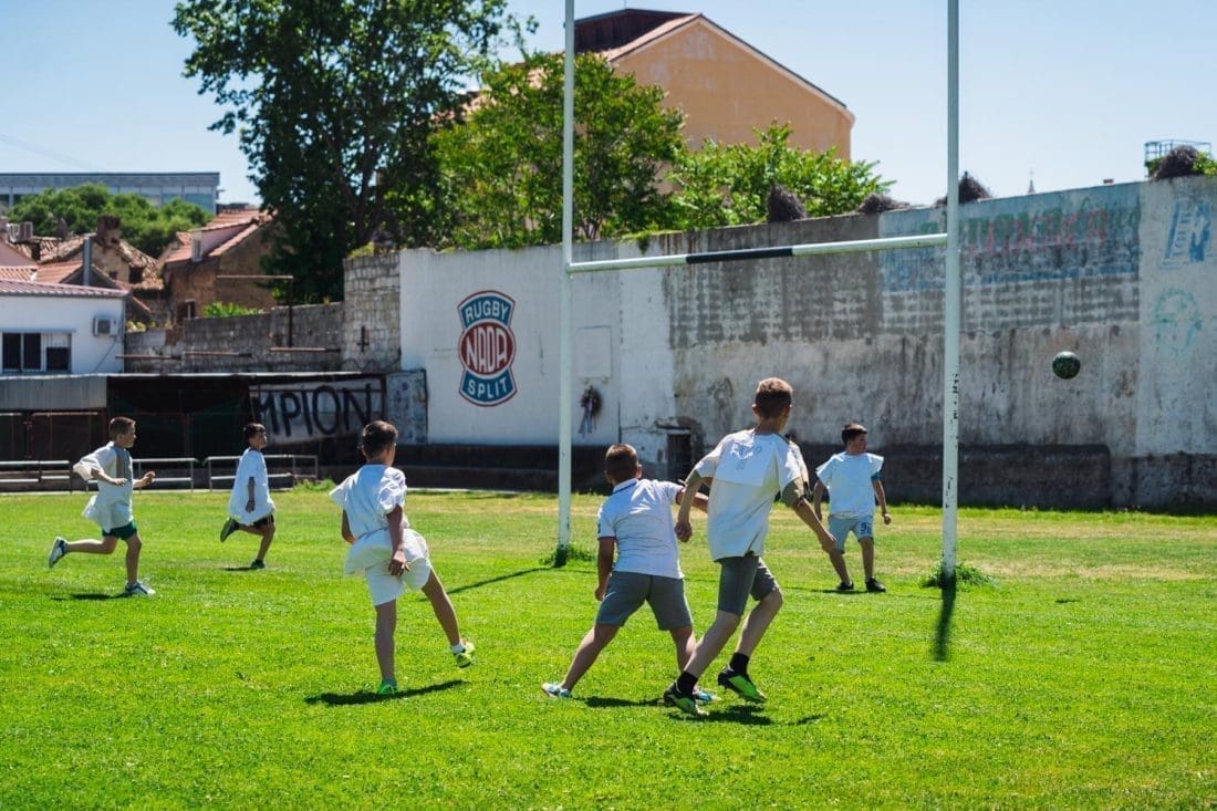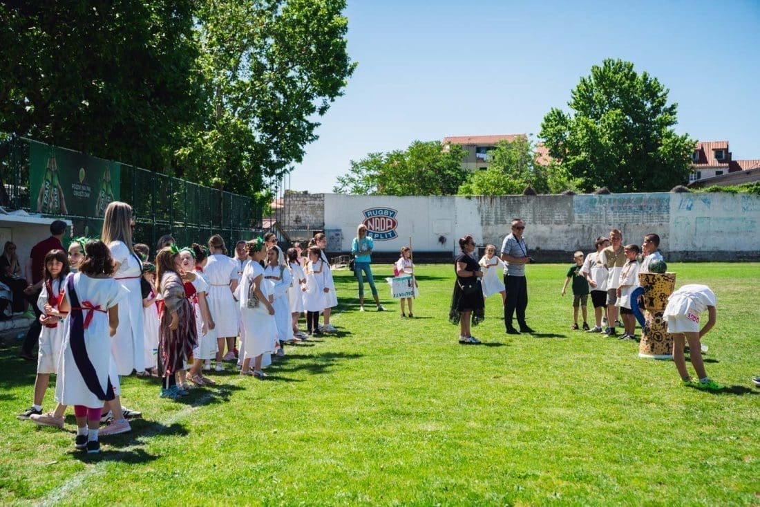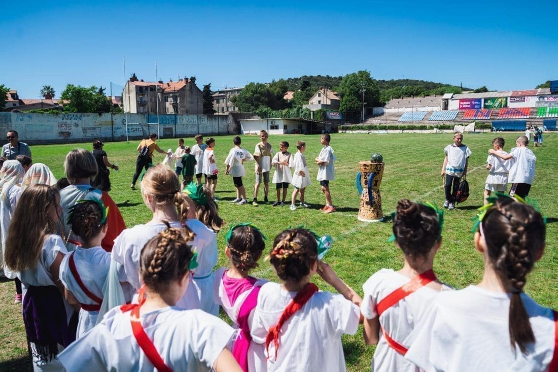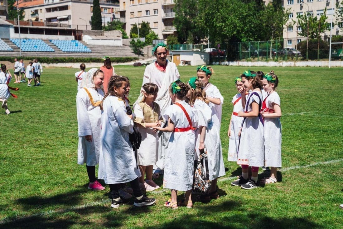 Zajedno sa svojim prijateljima Rimljanima iz 3.a i 3.b razreda OŠ Pujanki, u pratnji učiteljica, krenuli su kroz centar grada, preko Peristila, kroz Podrume pa do na Rivu. Svako malo su zastajali jer su znatiželjni turisti, ali i domaći, htjeli znati o čemu je riječ i fotografirati se sa zbilja sjajno kostimiranom djecom. Vesela povorka je potom s Rive krenula prema Starom placu gdje su ih dočekali predstavnici Ragbi kluba „Nada“ koji su im velikodušno ustupili teren.